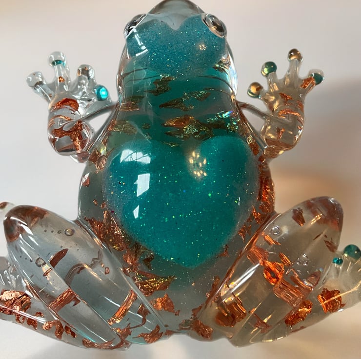 This handmade resin frog ornament features a sparkling teal heart and delicate gold leaf suspended inside clear resin.”