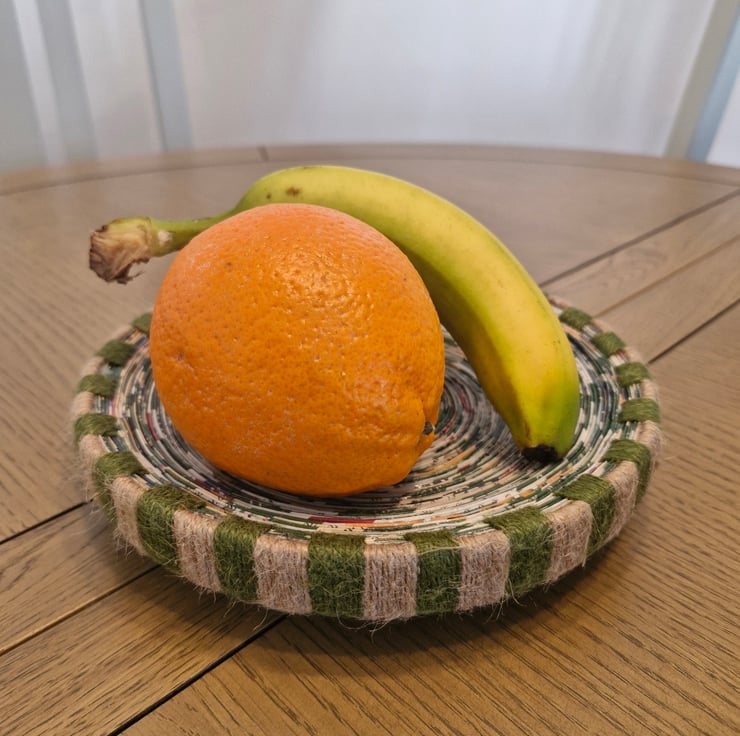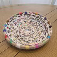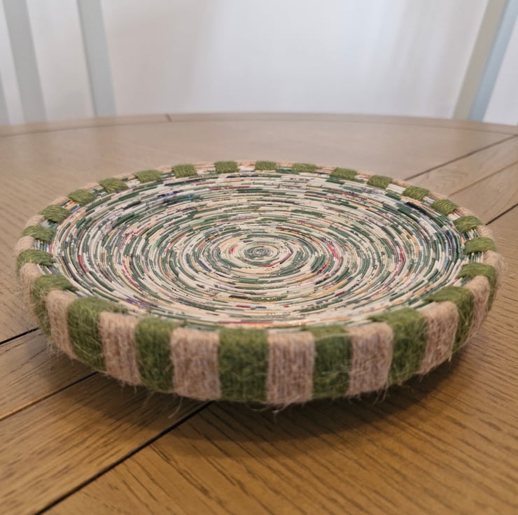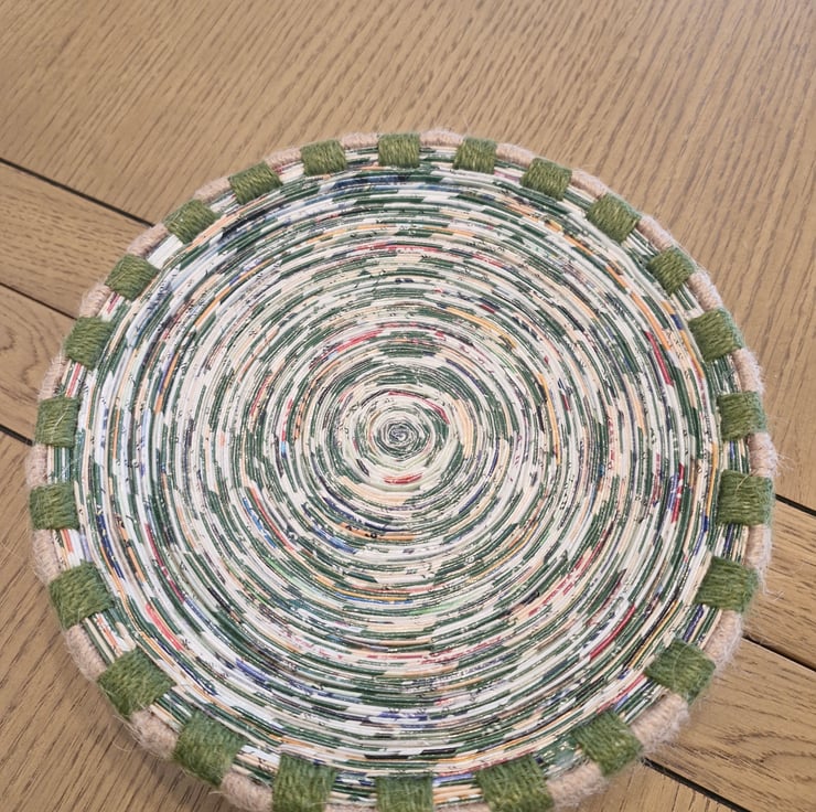 Lovingly handcrafted plate style bowl. Made from paper with a jute string trim.