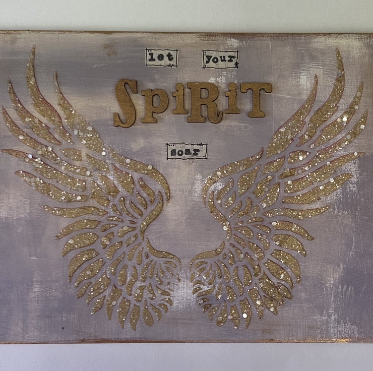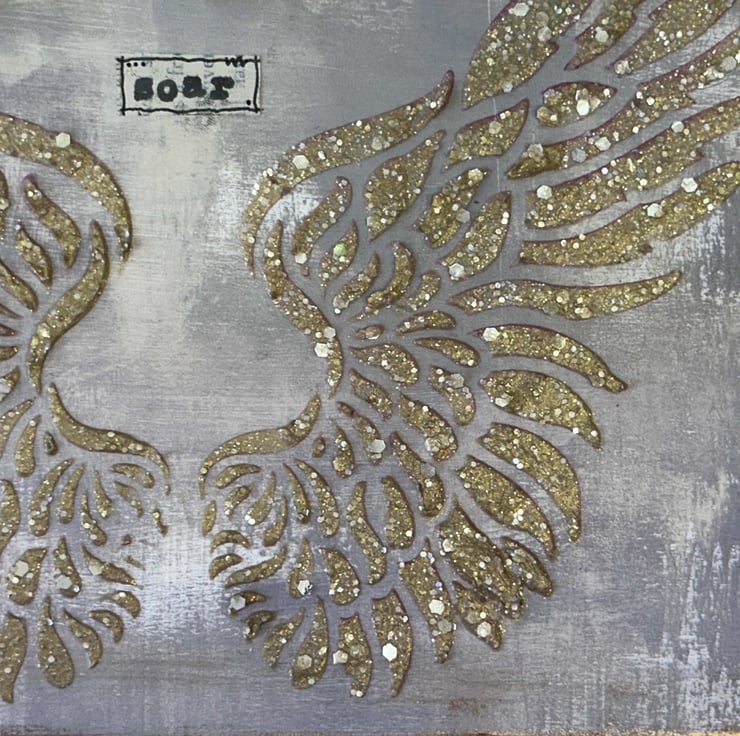 The wings are created using texture paste mixed with mica and glitter to create a relief pattern.