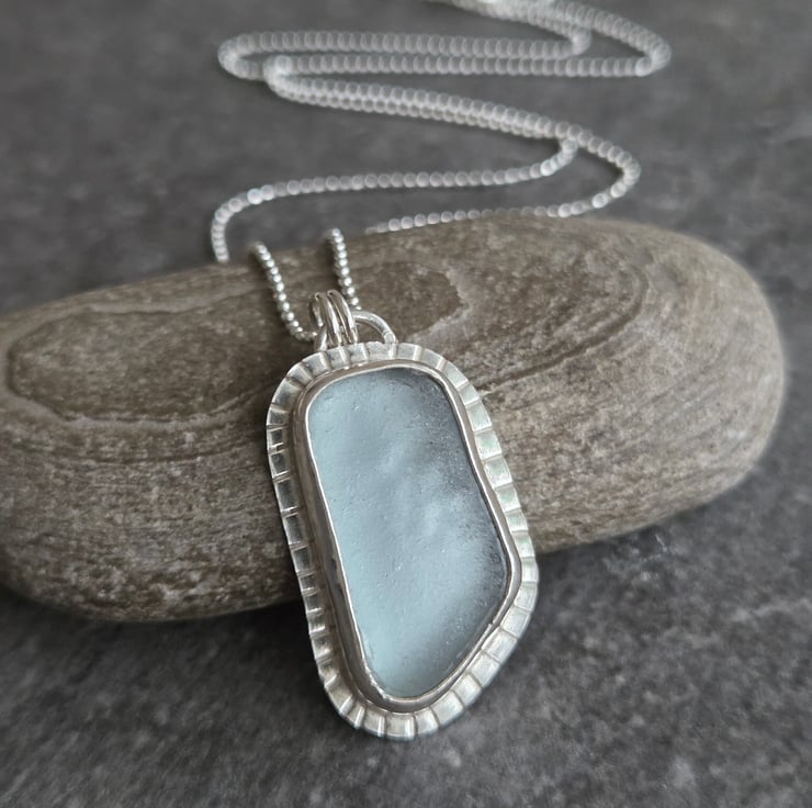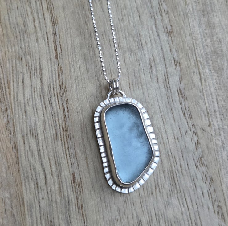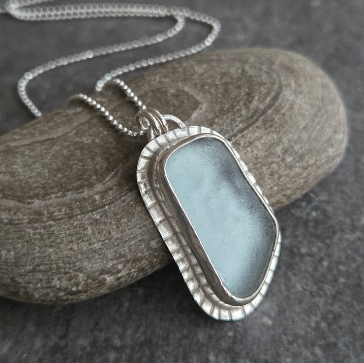 This pretty necklace features a piece of seaglass in delicate ice blue, set in sterling silver. I've left a little textured edging around the glass for extra detail and given the piece a polished finish.