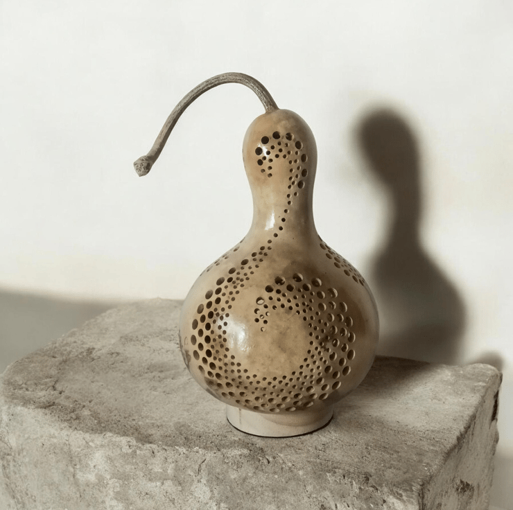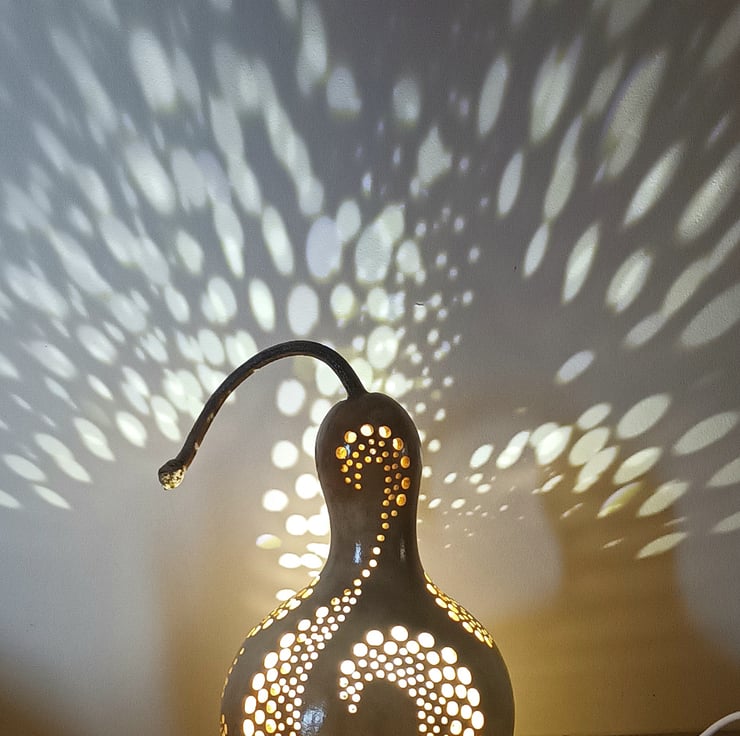 Pretty bottle gourd lamp drilled with hundreds of holes in a swirl pattern all over the gourd.