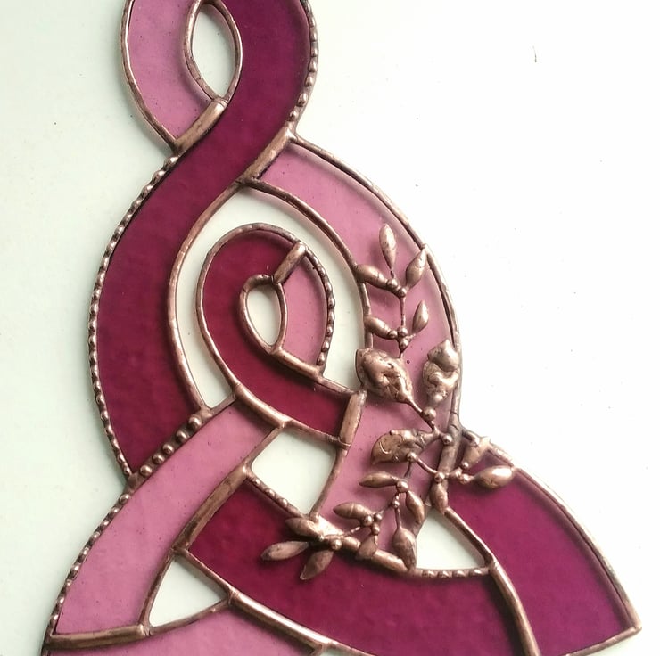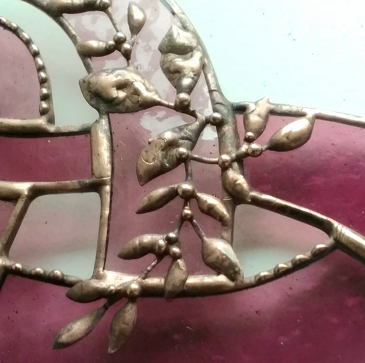 Hand-crafted from two coordinating stained glass types: soft blush-pink mystic cathedral for sparkle and shimmer and deep rose-pink stained corella for visual interest and colour throw, this tieless piece is adorned with a spray of soft solderwork foliage and finished with an aged copper patina.