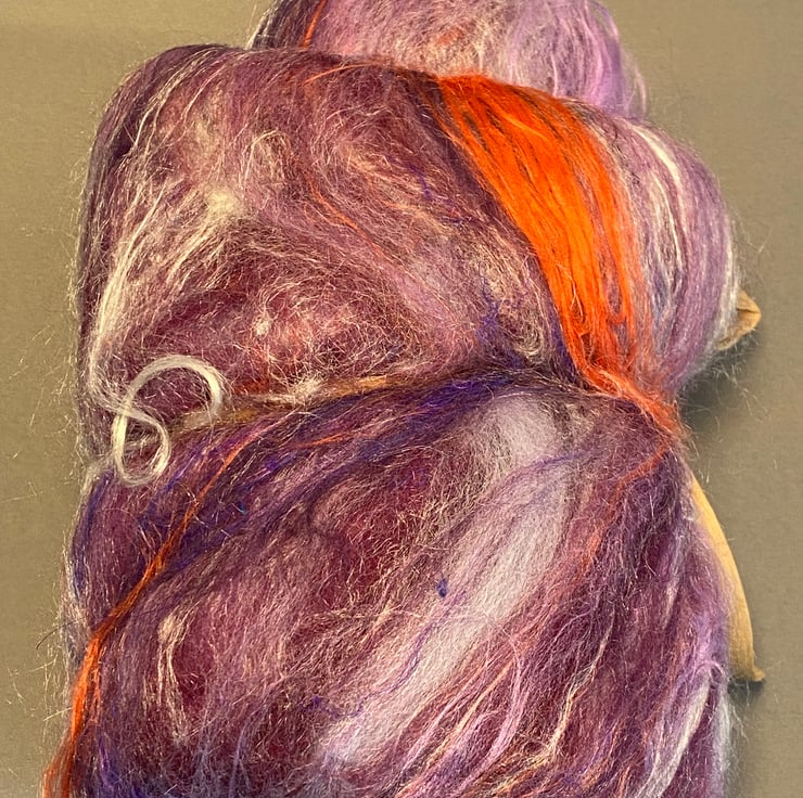 Here we have a beautiful art batts - main colour purples. It is hand created by me from things I have around my studio. My batts will always contain wool and will also contain some, but not all, of the following fibres - bamboo, silk, sari silk, angelina, banana.
