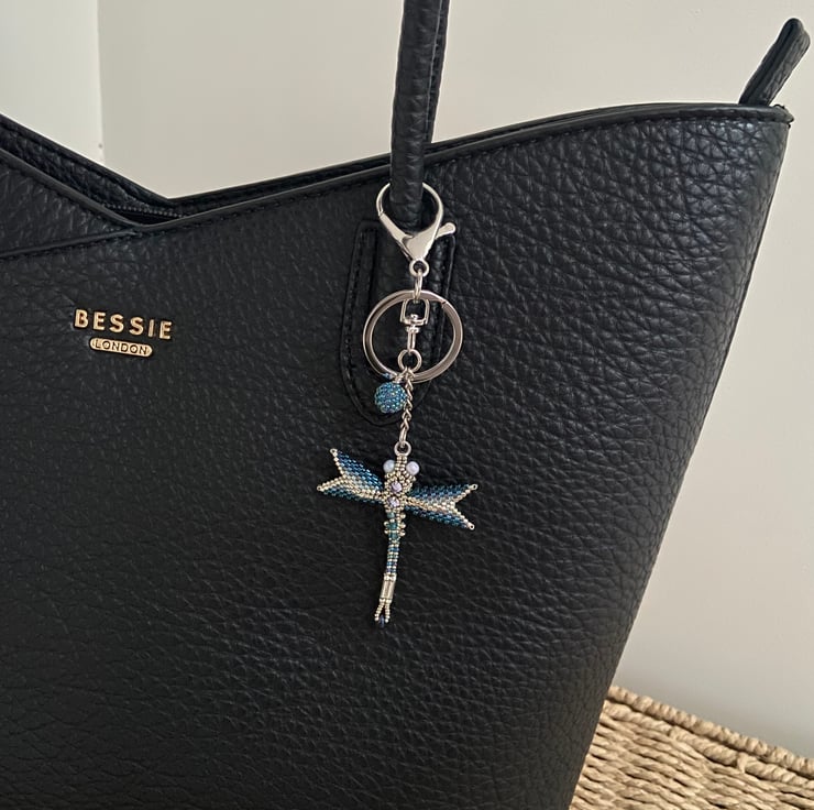 Blue and Silver beaded dragonfly bag charm/keyring. Made using Miyuki delica beads hand stitched in shades of blue and Silver with Swarovski crystal embellishments.