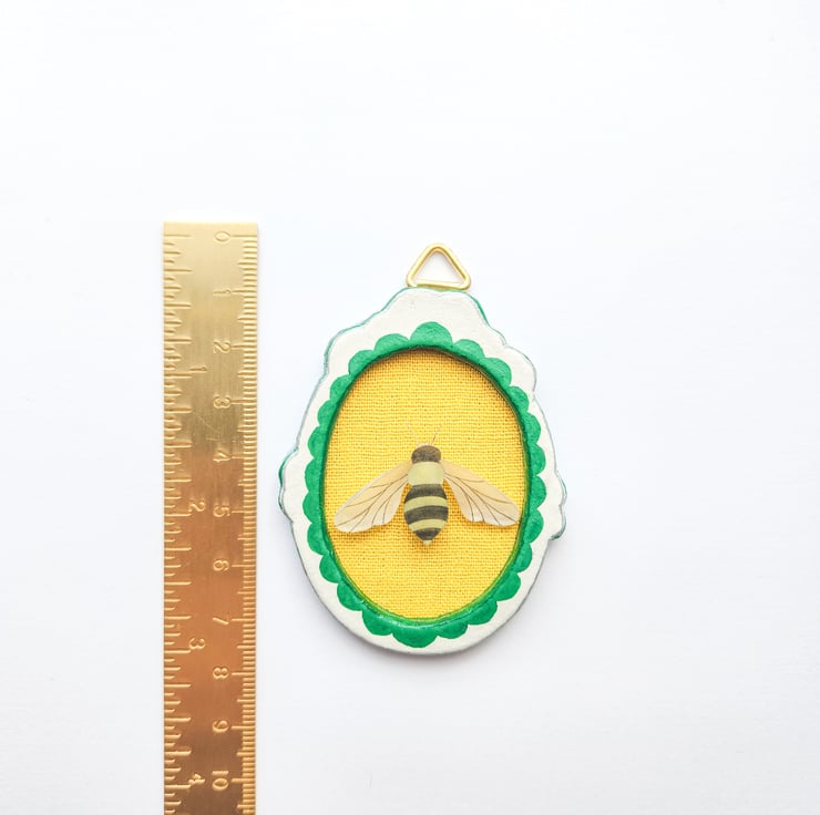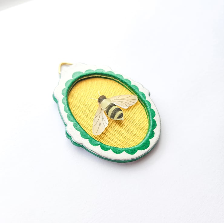 The insect element is hand-drawn and made from shrink plastic, carefully heated to create a slightly raised 3D effect that adds depth and character to the piece.