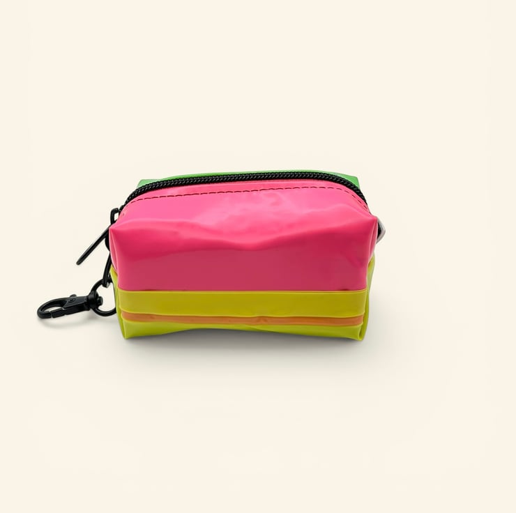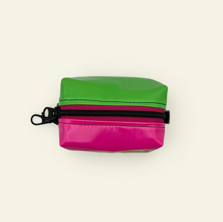 Each chunky keyring pouch is made from broken pool toys heading to landfill, and are lined with scavenged canvas from a boat canopy. There is a sturdy ‘ring pull’ style black metal zipper tab and a handy clip so that the pouch can be added to any bag as a colourful and useful accessory.