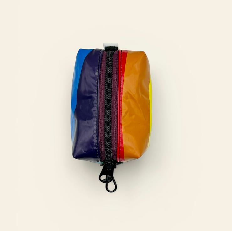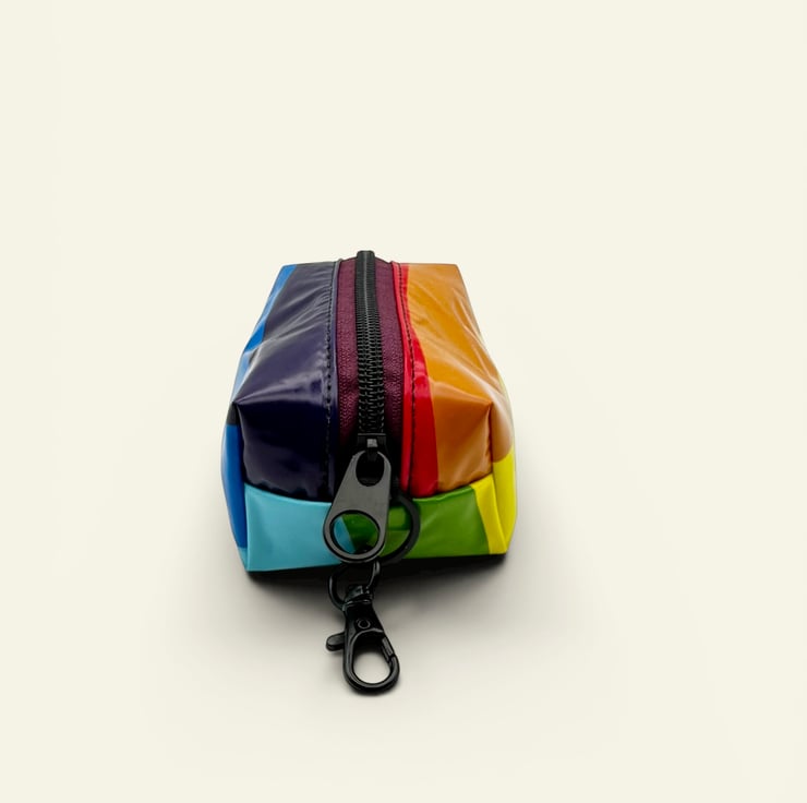 Each chunky keyring pouch is made from broken pool toys heading to landfill, and are lined with scavenged canvas from a boat canopy. There is a sturdy ‘ring pull’ style black metal zipper tab and a handy clip so that the pouch can be added to any bag as a colourful and useful accessory.