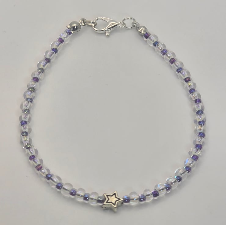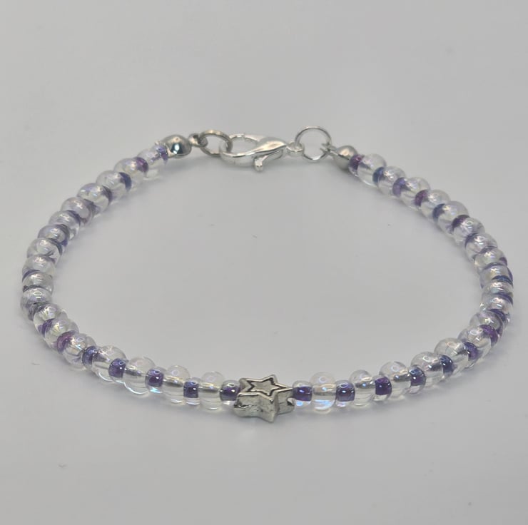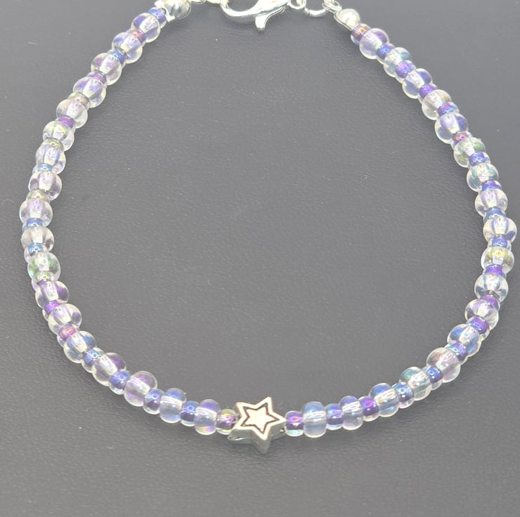 The bracelet has been made using large clear crystal seed beads which are separated with metallic amythest small seed beads. The amythest seed beads can look different colours depending on how the light hits, you can see blue colours. There is a metal star spacer bead in the centre of the bracelet. The beads are a thin beading wire and fasten with a silver clasp.