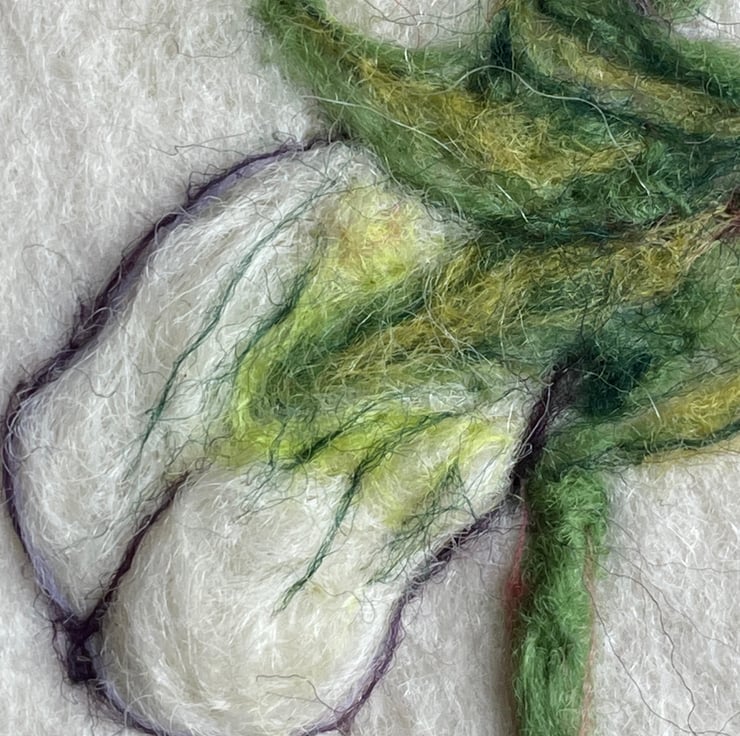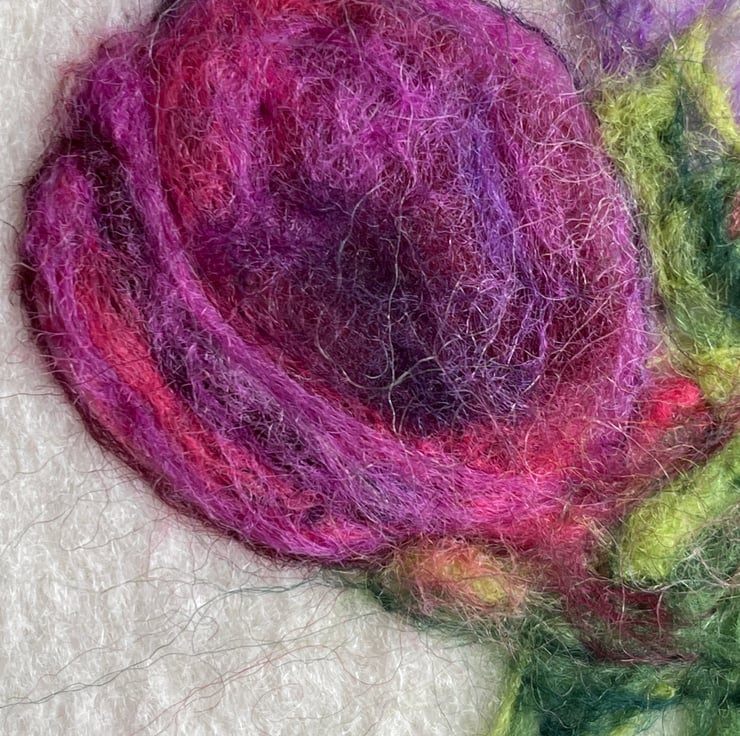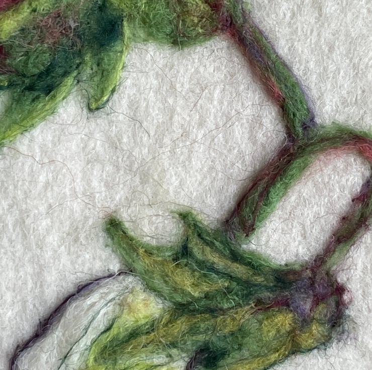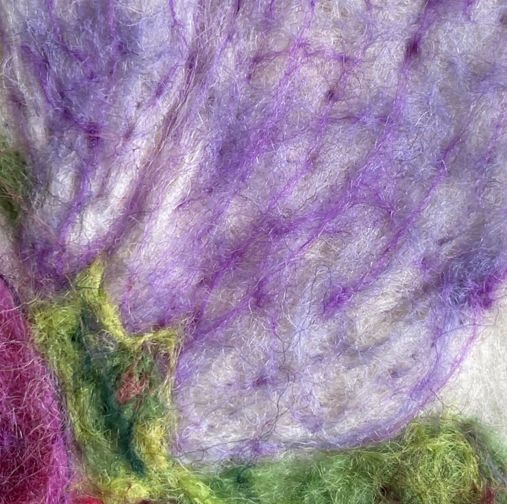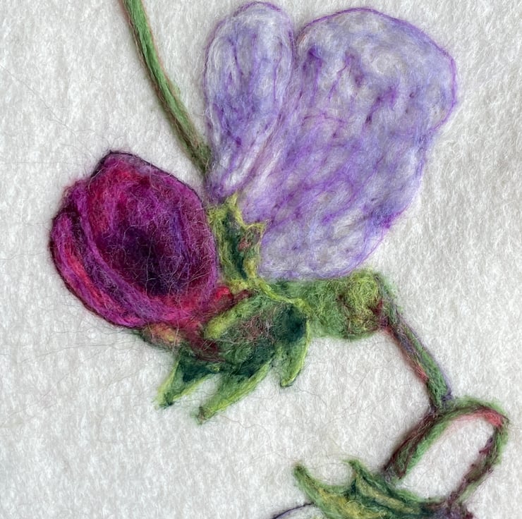 A hand felted Sweet Pea artwork crafted from merino wool. This unique textile piece captures the delicate features and colours seen in this beautiful flower, using the needle felting technique. The flower is ‘painted’ with wool, felted onto a natural base with added details to bring out the flowers characteristics. Every piece is completely handmade and unique, making it a lovely original gift for nature lovers, gardeners or anyone who loves the soft texture and warmth of textile art.