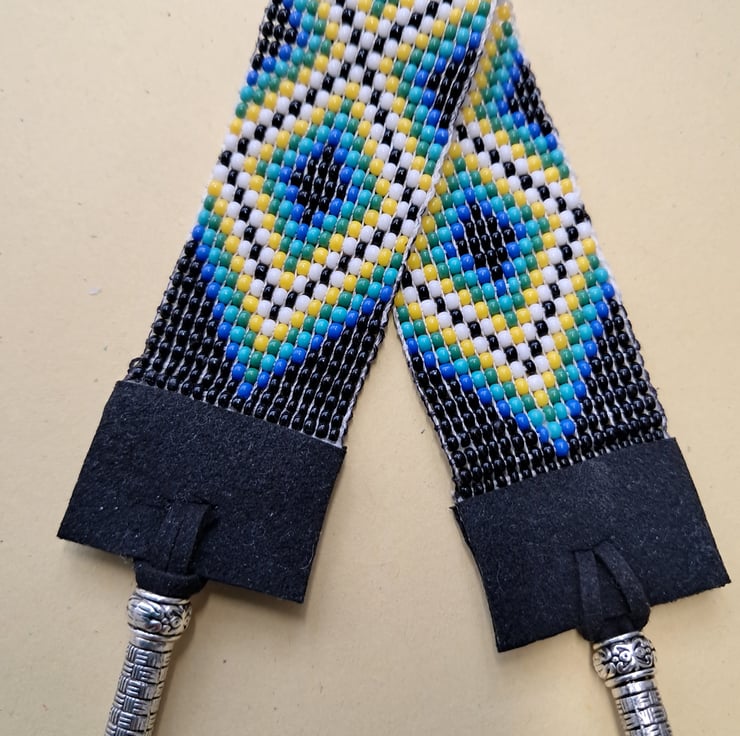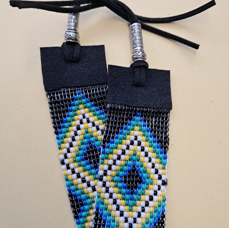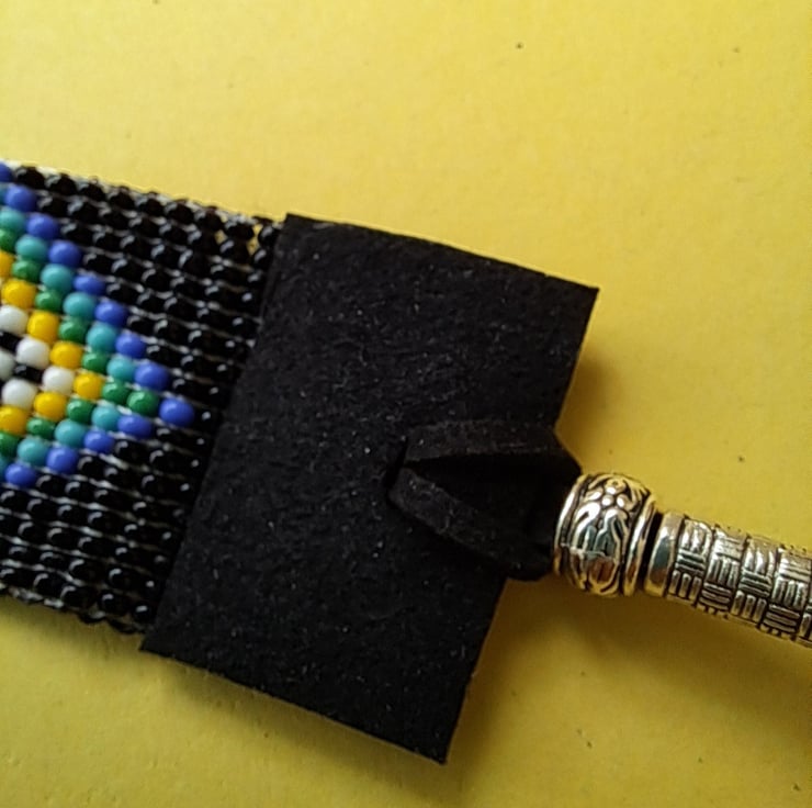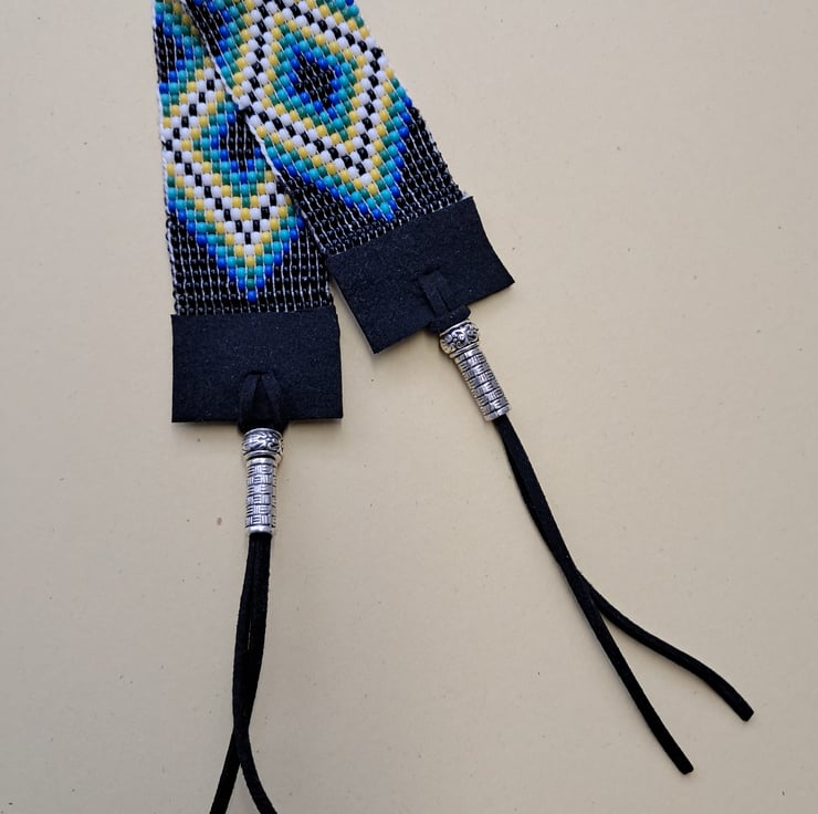 Beaded Suede Anklet. With Black, Blue, Torquiose, Yellow and White high quality seedbeads. Handcrafted on a loom. Suede ends and ties. Tibetan silver endings. Will fit up to 8.1/2" ankle. Depth 30mm. Super different. Very fluid to touch. Thankyou for looking. Lori