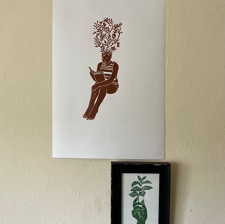 A linocut print of a passionate reader, printed on handmade paper in burnt sienna ink.