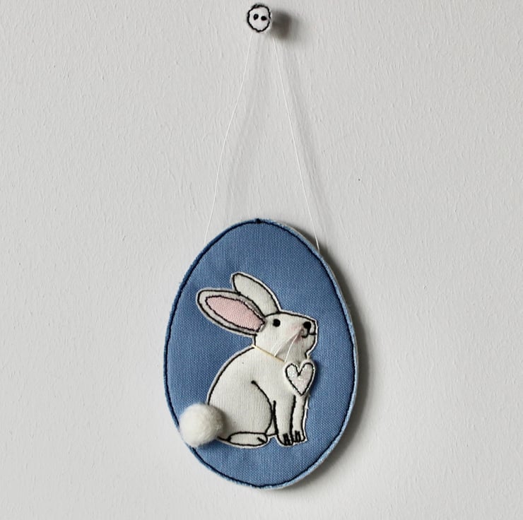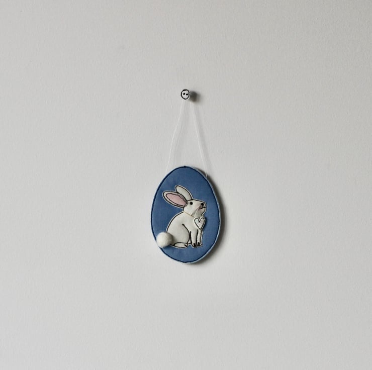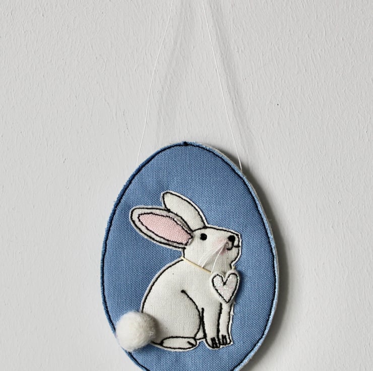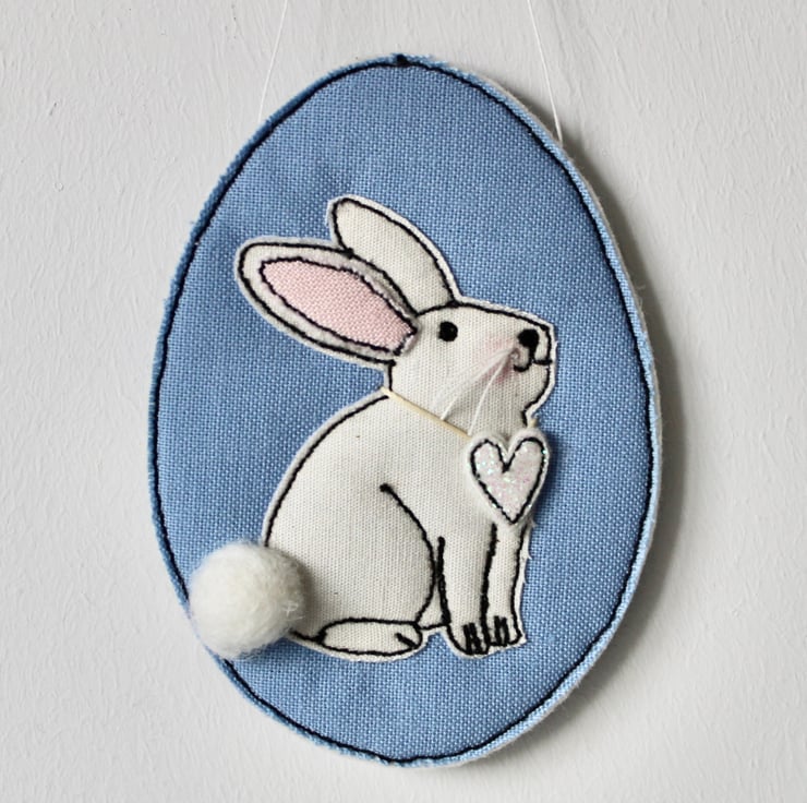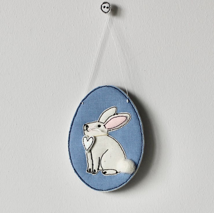 Bunny egg is sewn using 100% wool felt, cotton cloth, glitter cloth and free hand machine embroidery; multiple layers of cloth are sewn together and cut out by hand using very sharp scissors. With a handmade felt ball for a tail and a linen string to suspend.