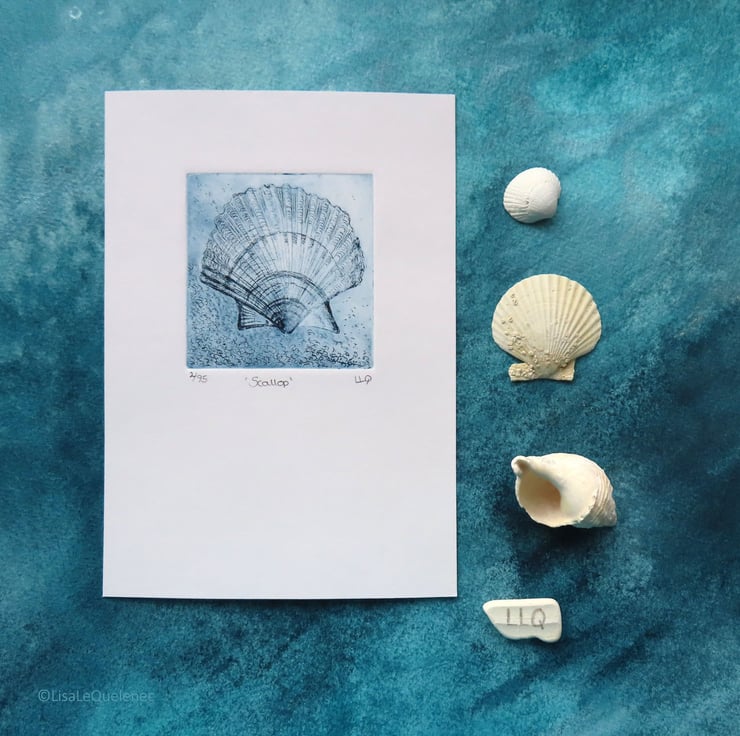 Original handmade etching print no.2 of an edition of 95 of a scallop sea shell. Image size 7.5x8cm ( approx 2.75x3inch) -paper size 14x20cm (5.5x8 inch approx) The artwork will be shipped in a cellophane sleeve with cardboard front and back for added protection.