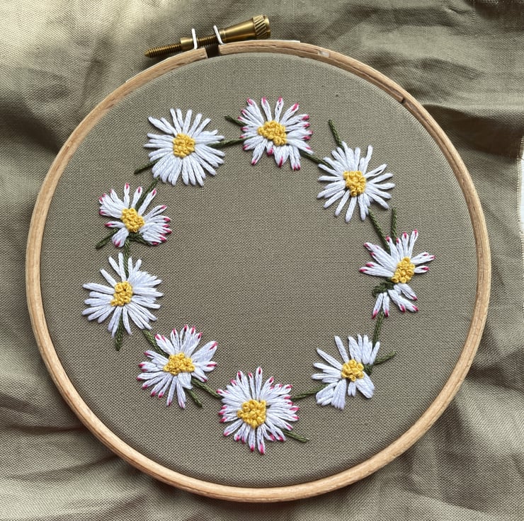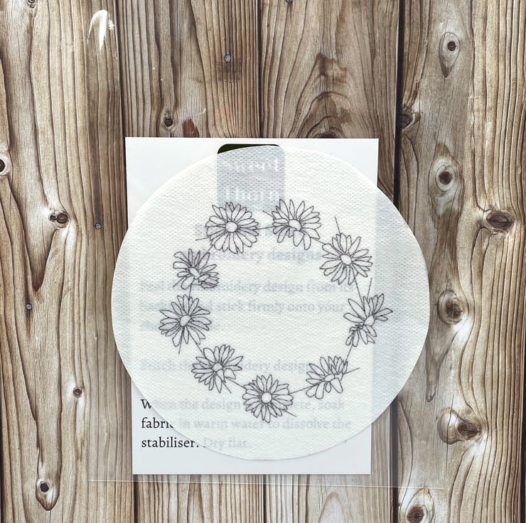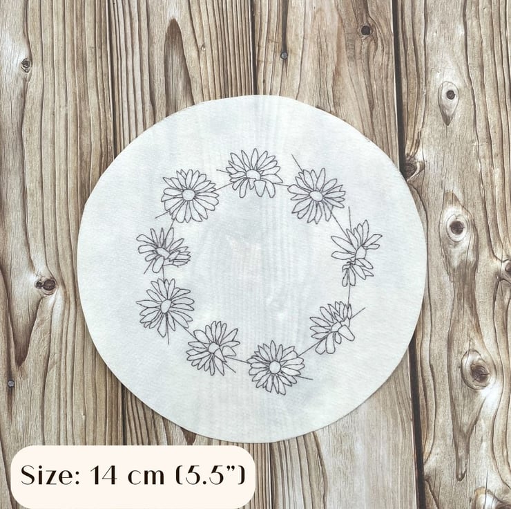 daisy embroidery, cute daisy chain, rustic flower design, common lawn daisies, botanical embroidery, stick and stitch, floral stick and sew, daisy flower patch, sticker transfer, biophilia textile, DIY hand embroidery, water soluble craft, cottagecore flower