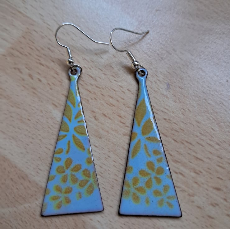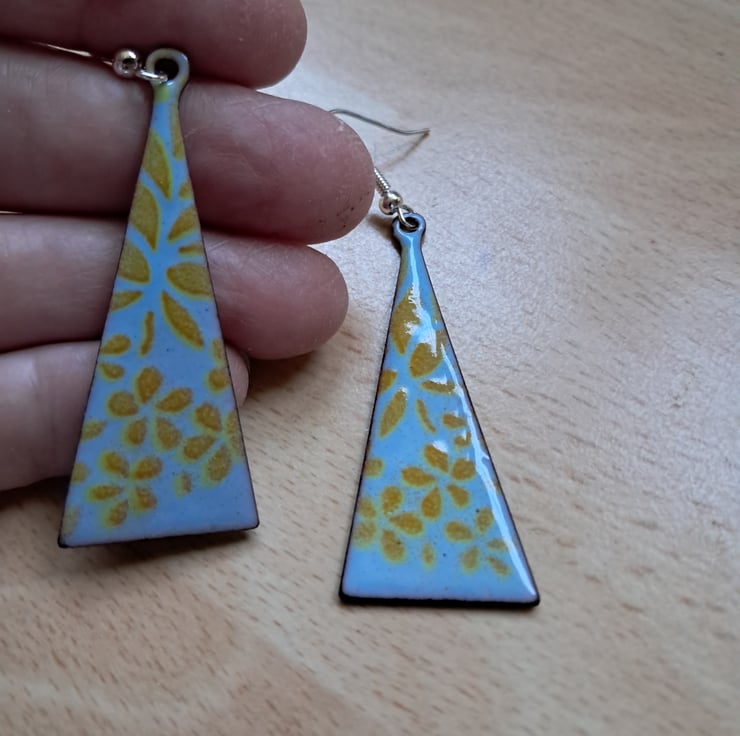 These earrings are made with enamel fired onto copper to give a durable finish. They measure 2 x 5.3cm. The pattern is created by stencilling a design in a contrasting colour to the base, in this case orange on blue. The backs are also enamelled in blue. The earwires are silver plated.