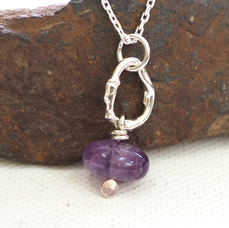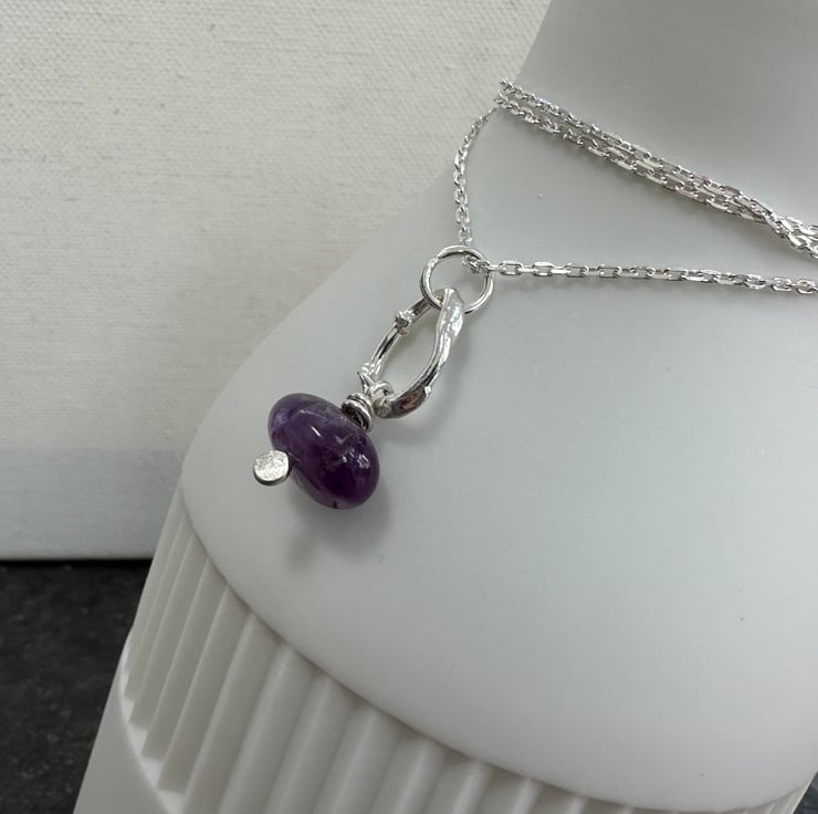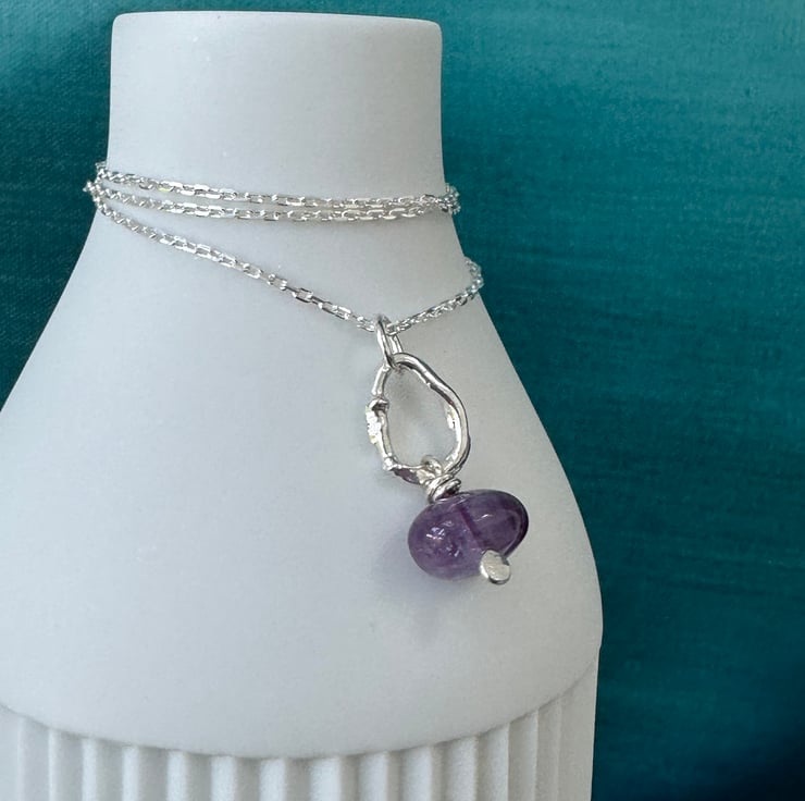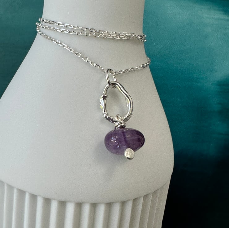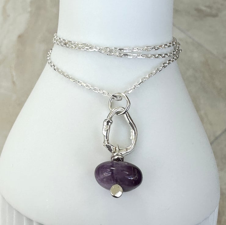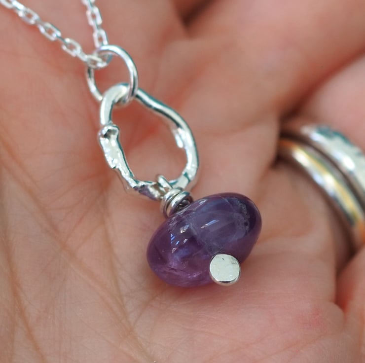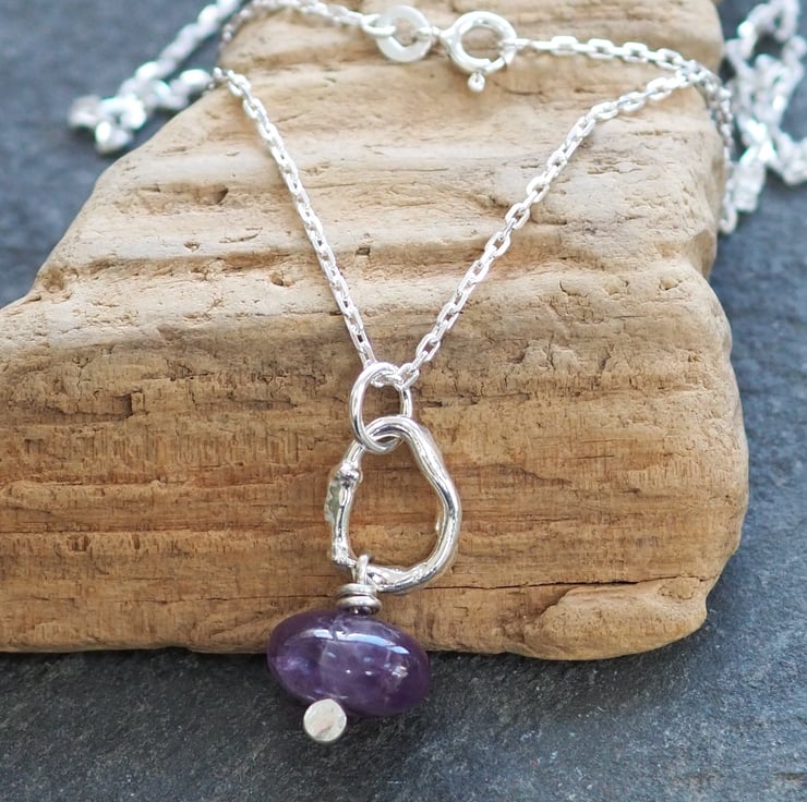 This one of a kind handmade silver pendant is made from recycled molten silver formed into a loop with a chunky amethyst pebble hanging beneath. The silver is free formed (without a mould or cast), which gives the loop a unique organic feel.