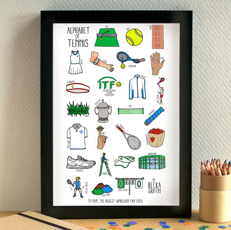 A fabulous alphabet illustration, featuring all things tennis related.