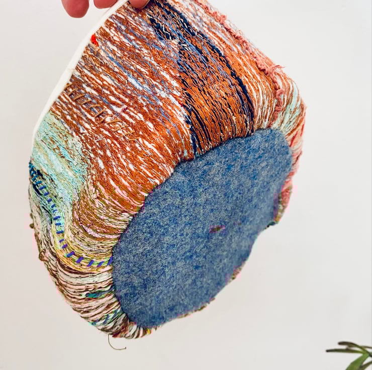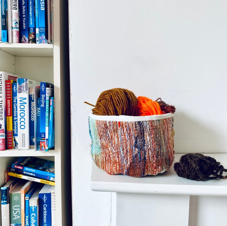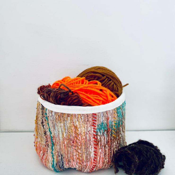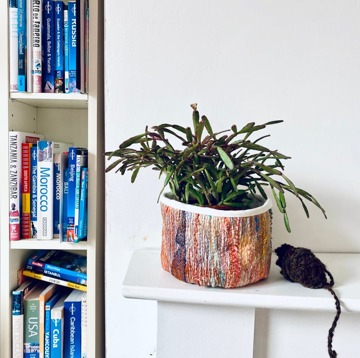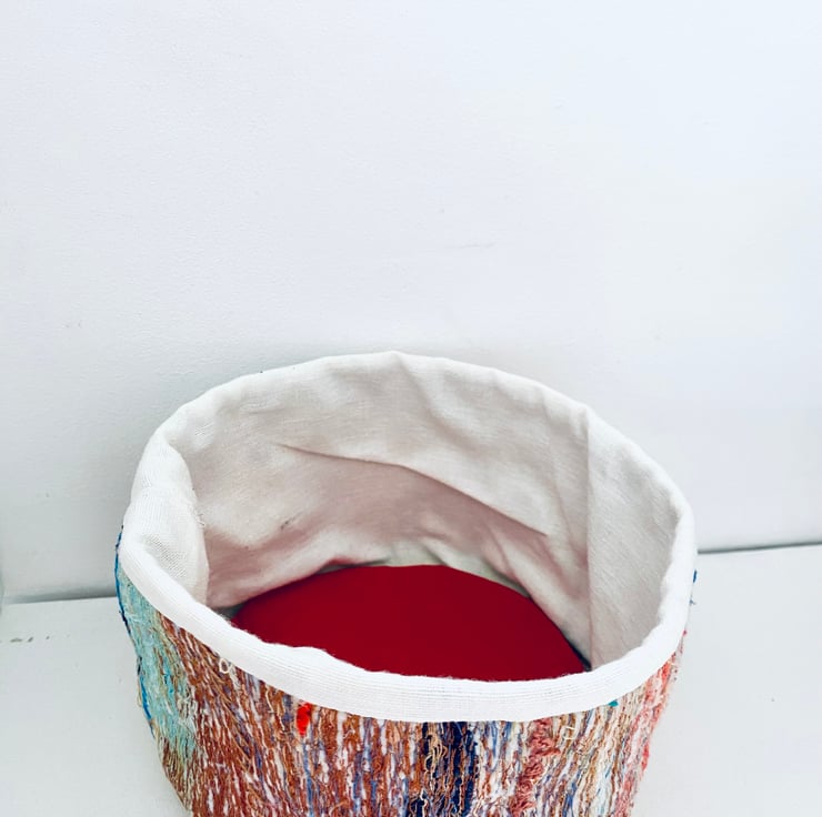 A unique and decorative pot. Made with a mix of preloved fabrics, this colourful textile vessel has been hand and machine embellished.