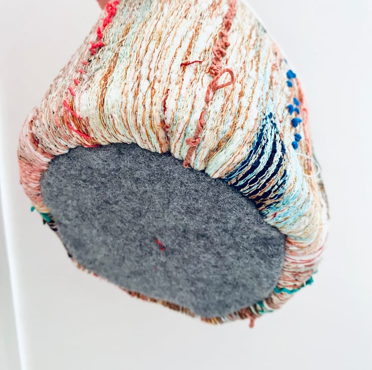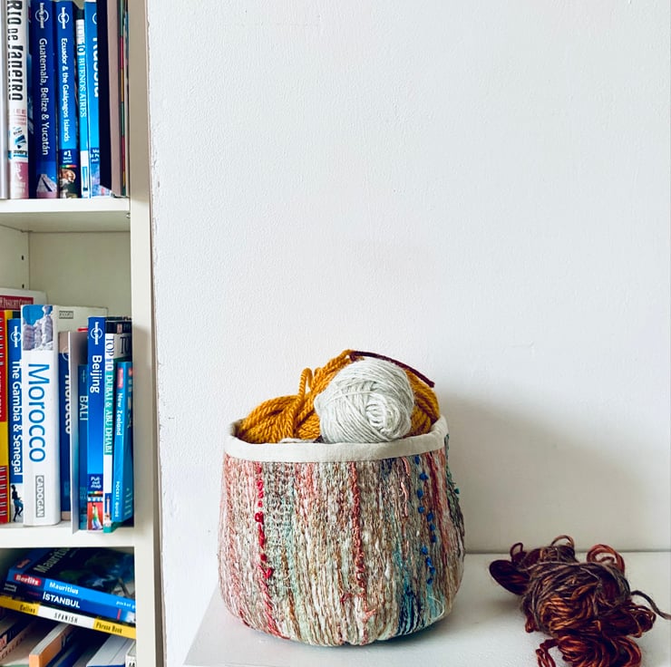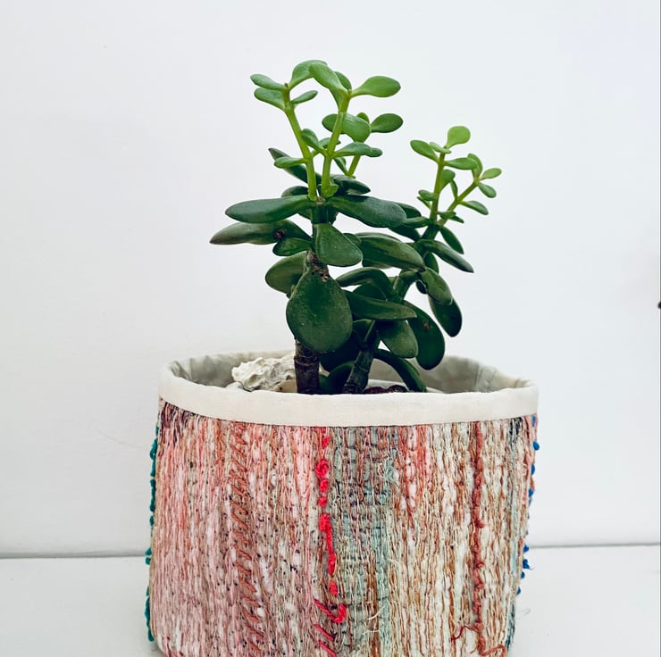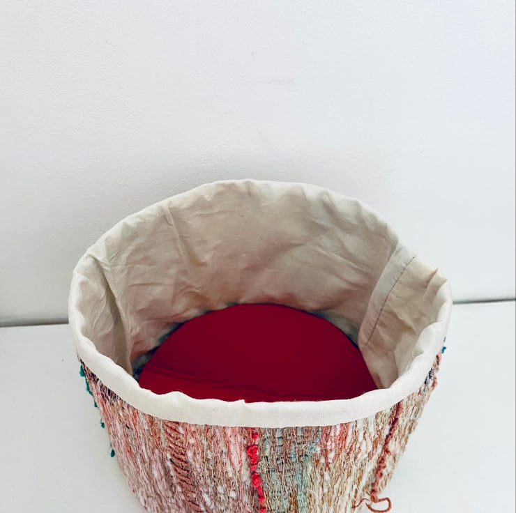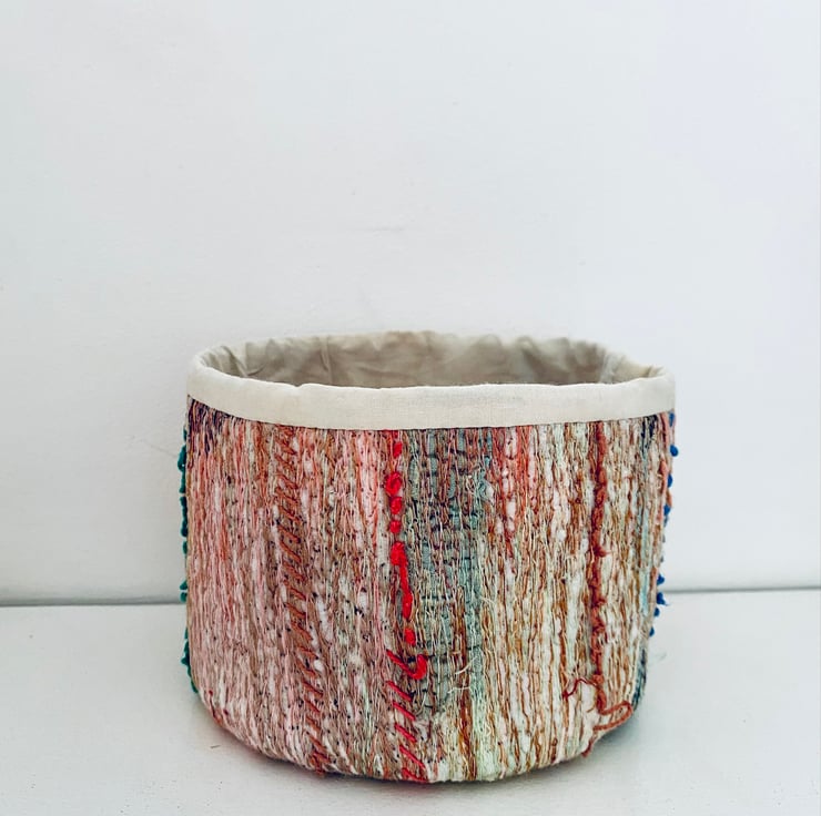 A unique and decorative pot. Made with a mix of preloved fabrics, this colourful container has been embellished with hand and machine stitching.
