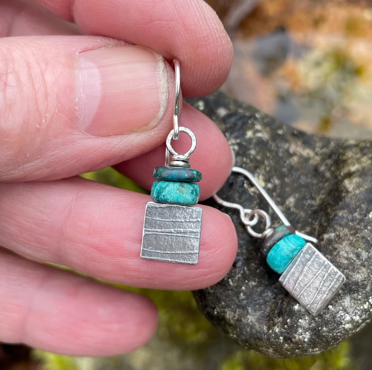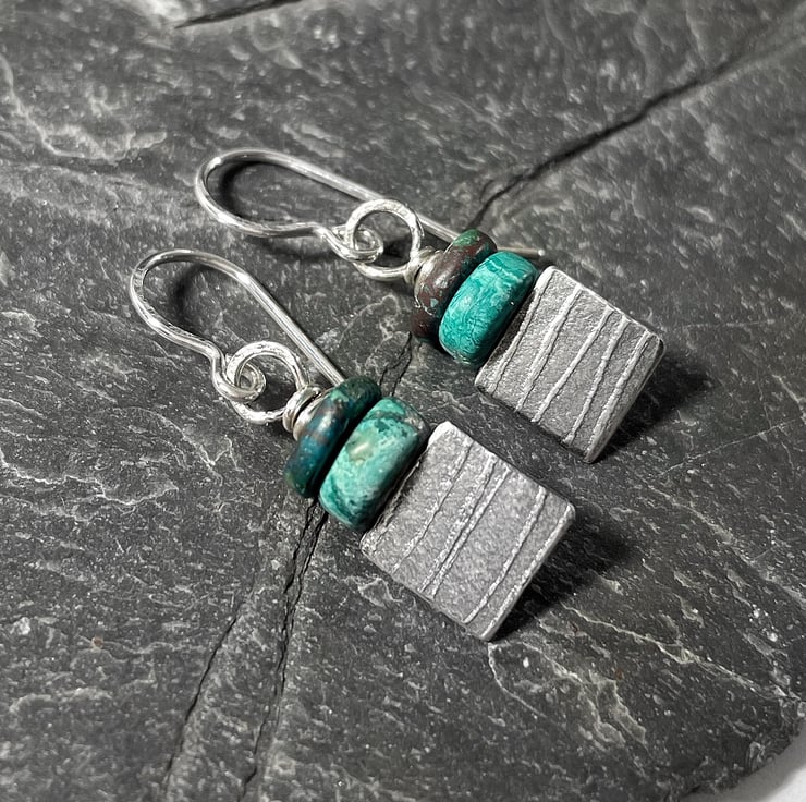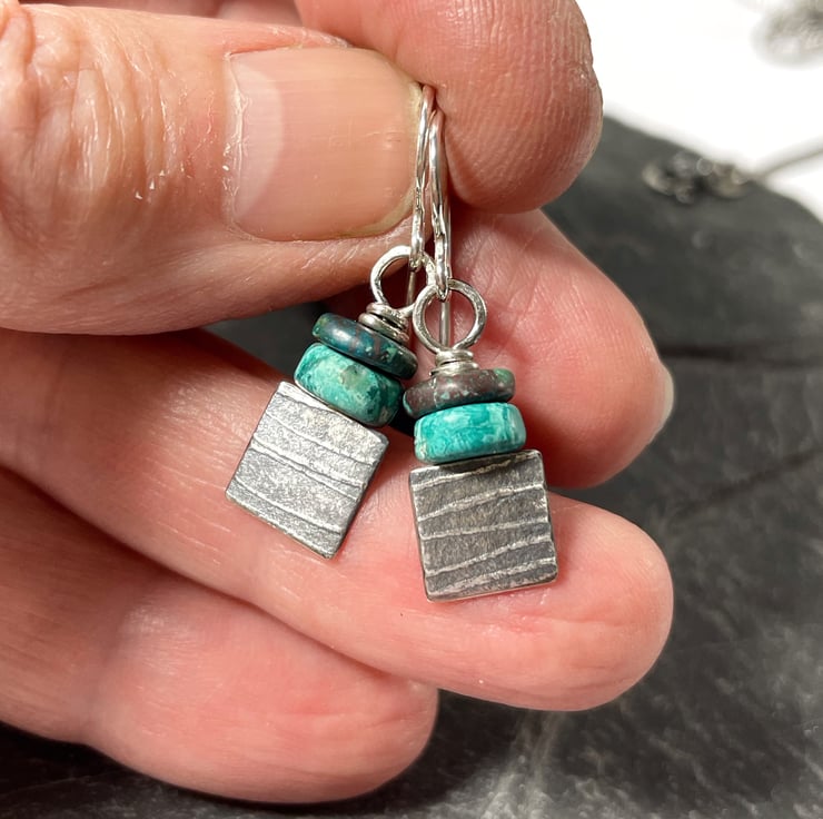 Squares of patterned oxidised silver are topped with a pair of shattukite disk beads, these hang from handmade hooks.