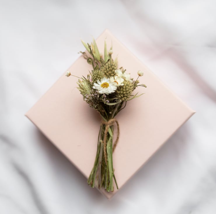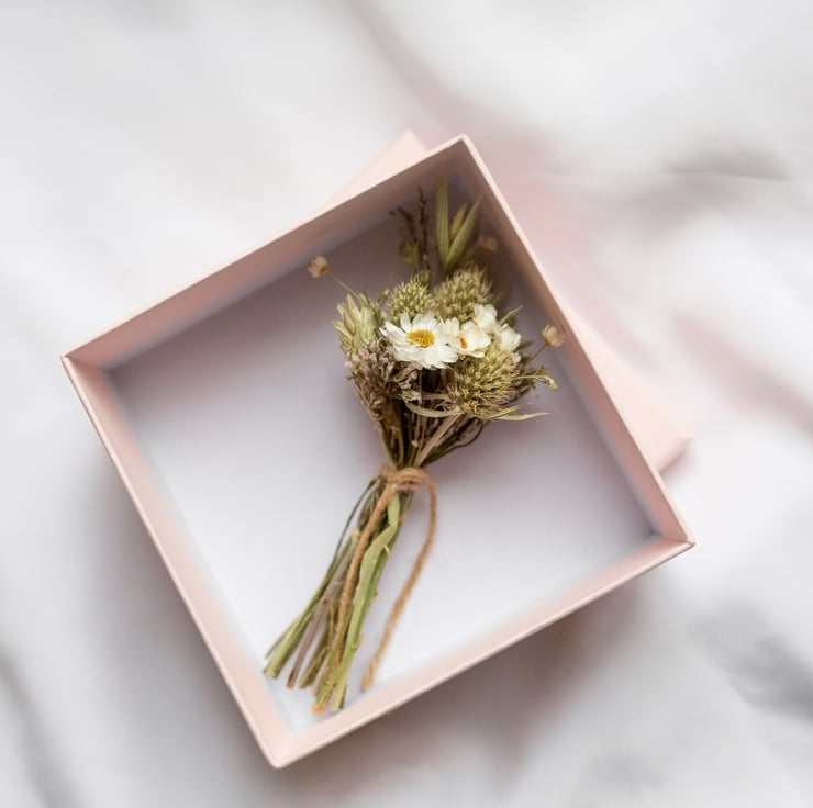 Delicate everlasting dried flowers carefully arranged and present in a gift box ready to gift