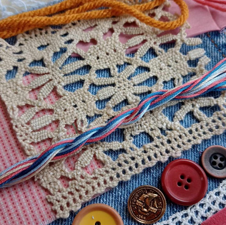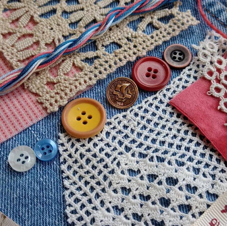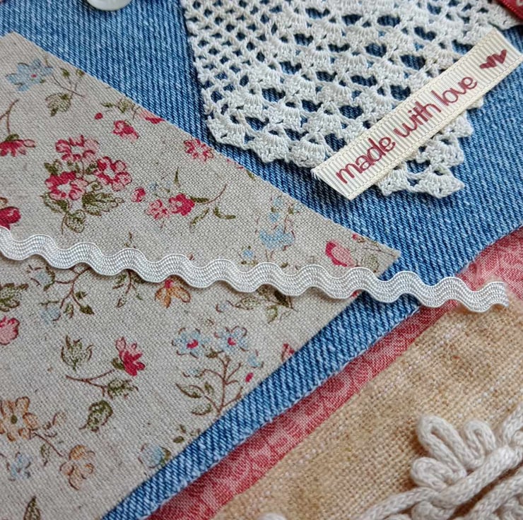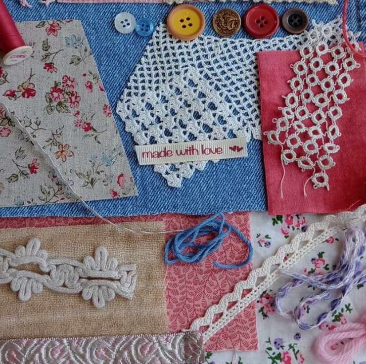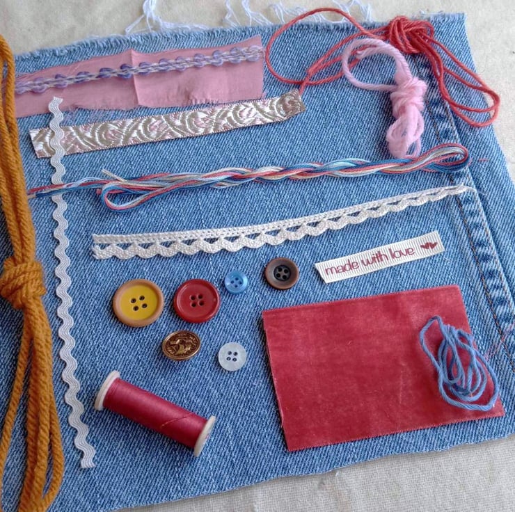 Blue denim with rose pink - this rich collection of fabrics and trims is ideal for slow stitching projects, textile art or just to use in other sewing projects. A perfect gift for a teenager or just treat yourself.