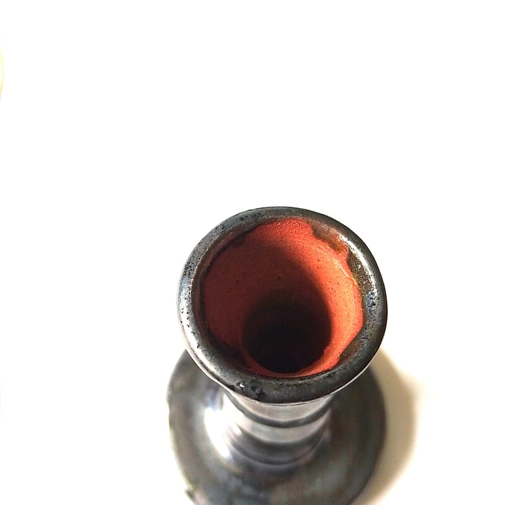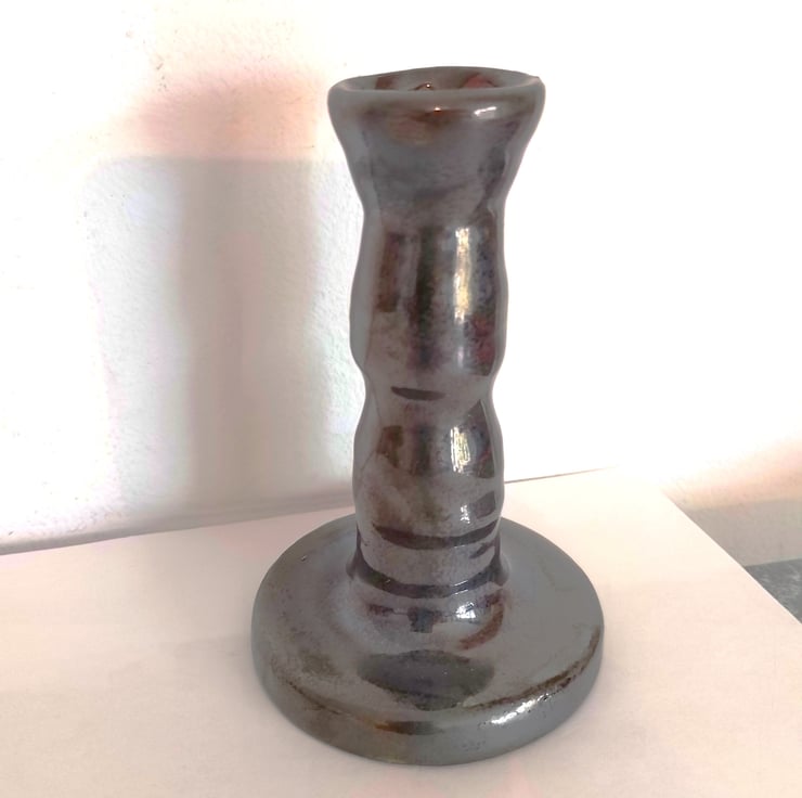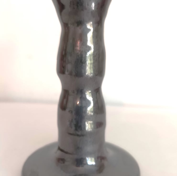 Made and designed by Penarth Ceramics in the United Kingdom, this is a Pottery Candlestick, made (thrown) with the traditional Potters wheel, from red earthenware clay. Decorated in a very interesting glossy dark silver metallic finish. Suits all tapered and long domestic candles. Stands 11 cms x 7.2 cms wide base.