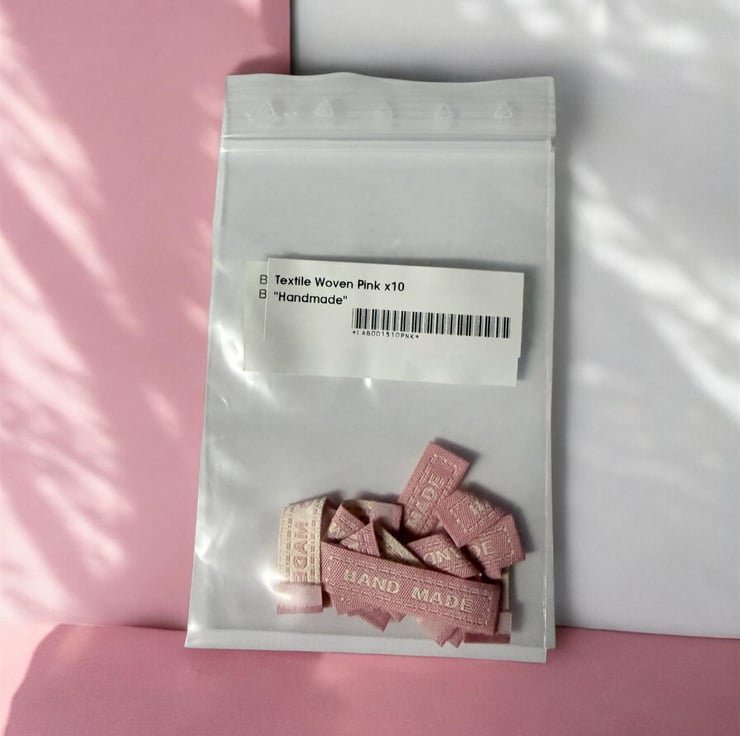 Woven “Hand Made” Label, pack of 10, colour Pink with white wording, Washable, colour fast, craft labels.