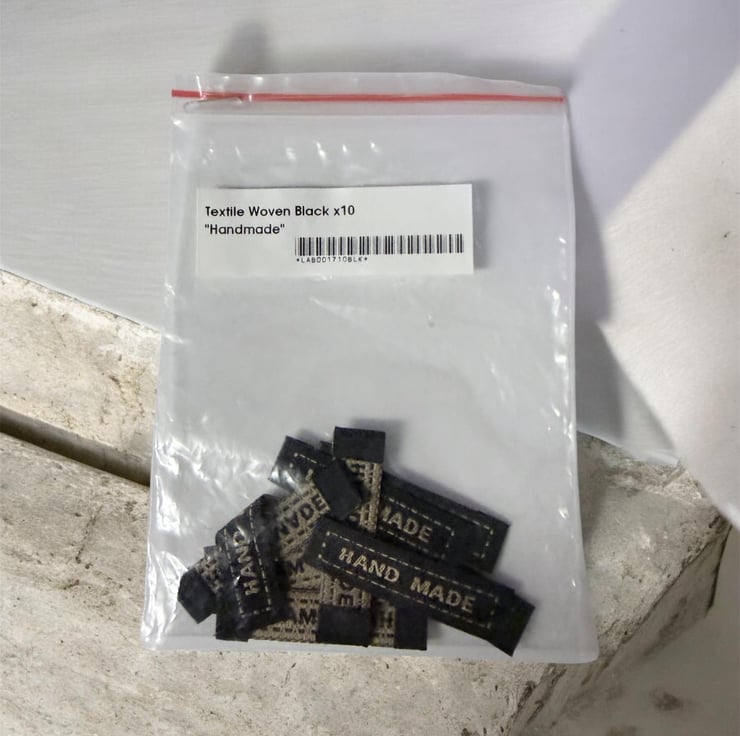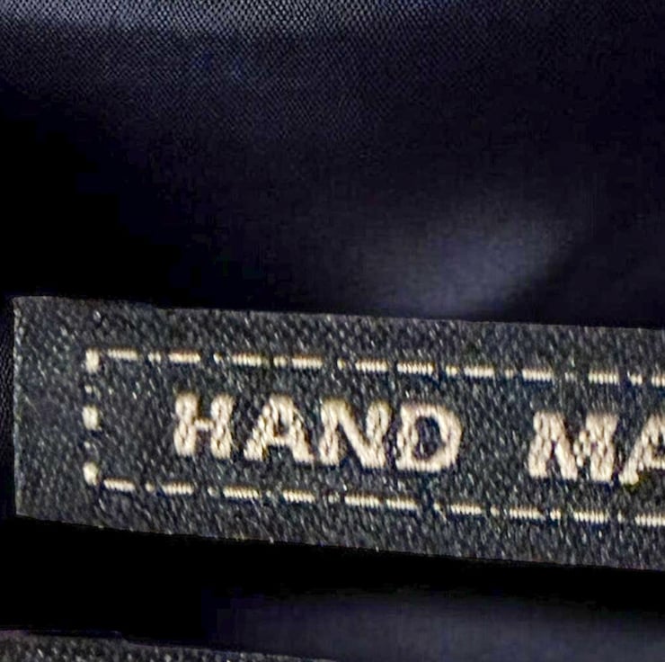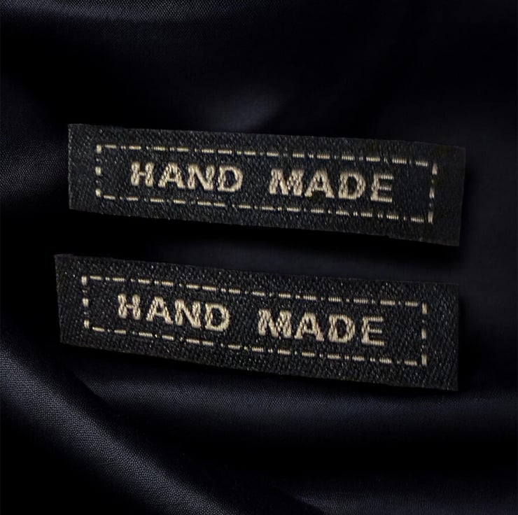 Woven “Hand Made” Label, pack of 10, colour Black with Brown wording, Washable, colour fast, craft labels. Make your crafting stand out.