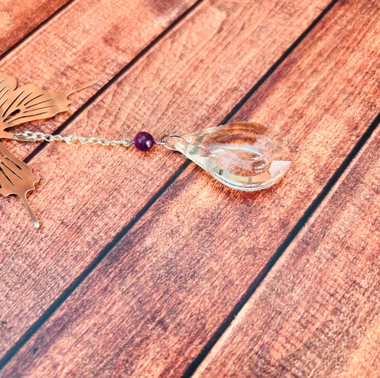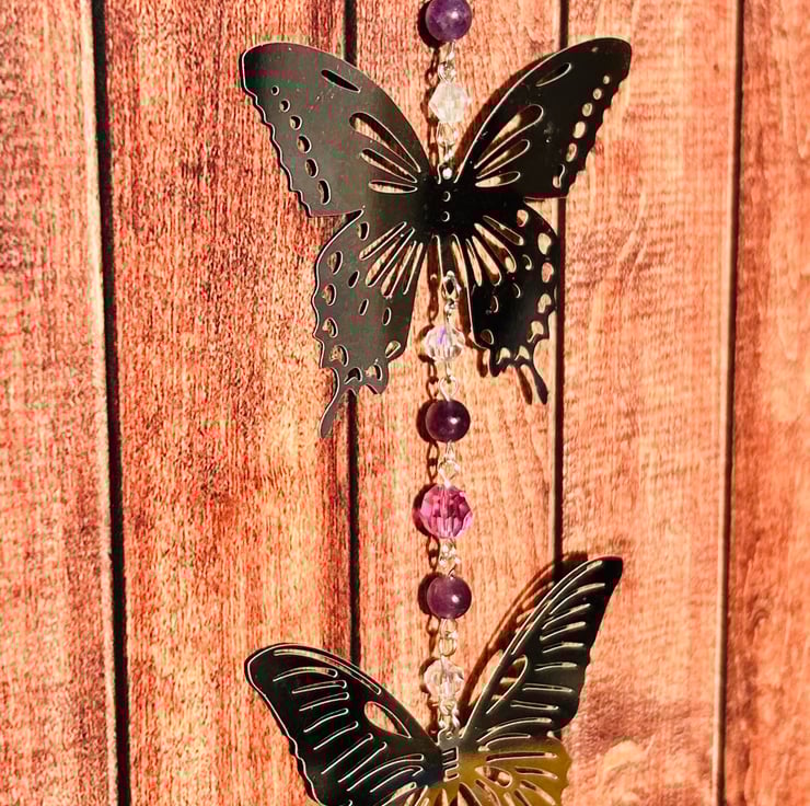 This elegant hanging decoration features three delicate butterfly charms connected with shimmering crystal beads and Amethyst gemstone accents, finished with a faceted crystal drop that catches and reflects the sunlight beautifully.