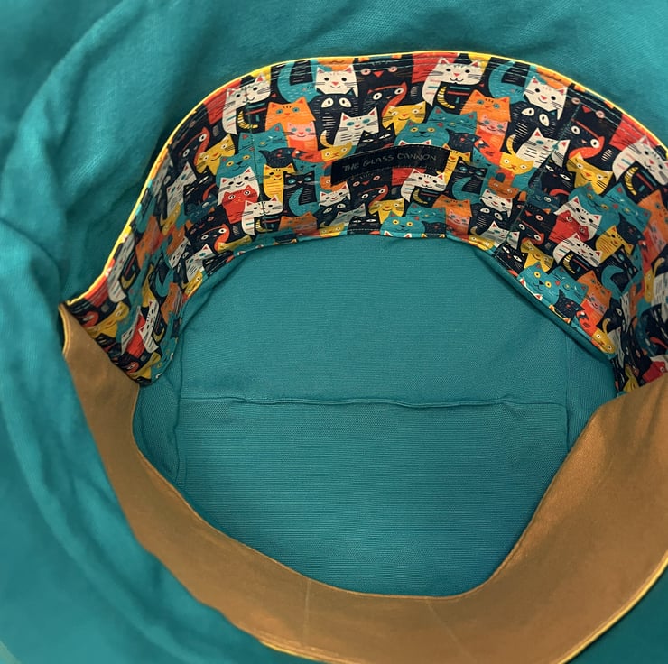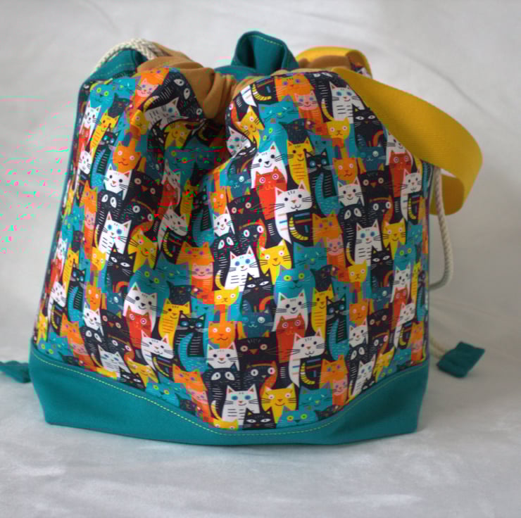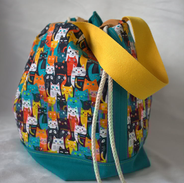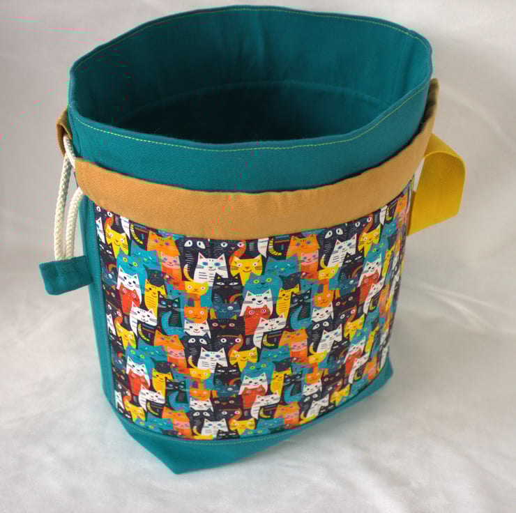 A combination or Medium woven interfacing and non woven interfacing to give structure without adding too much bulk or stiffness. Made from turquoise / teal / marine green soft cotton duck canvas (exterior base, side panels and lining) with terracotta / apricot duck canvas cord casings. Yellow Cotton poplin for pocket linings and the main exterior print fabric is a 100% cotton bold multi coloured cat print by Rose & Hubble.