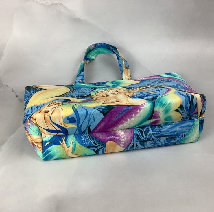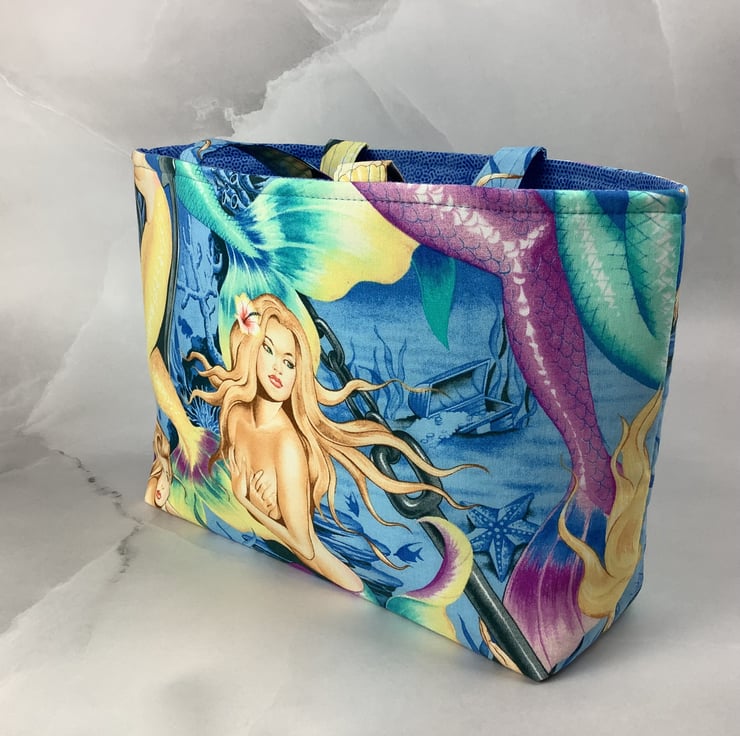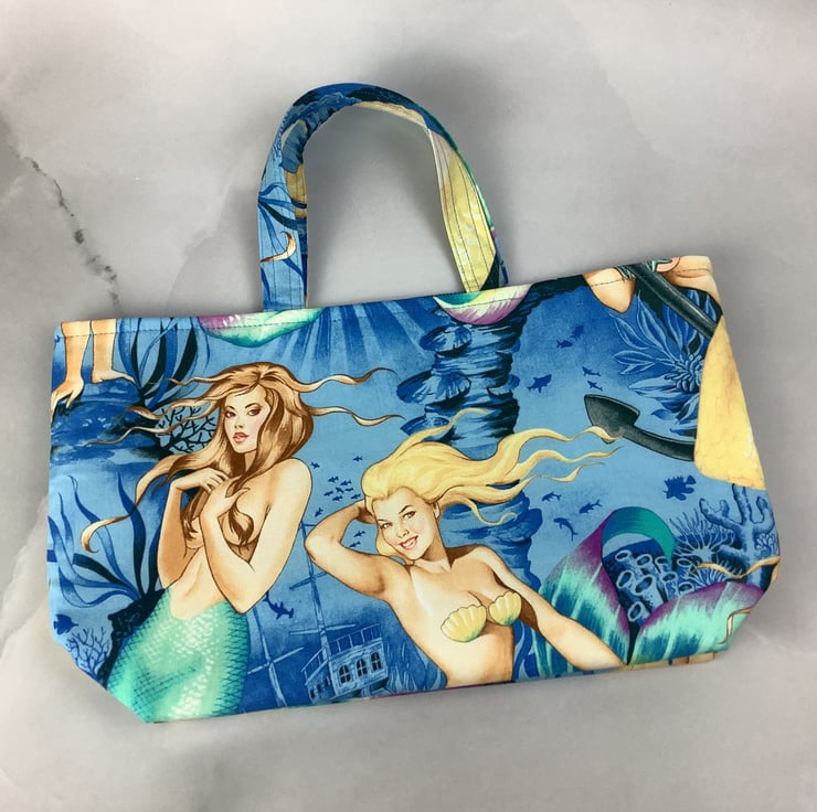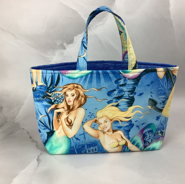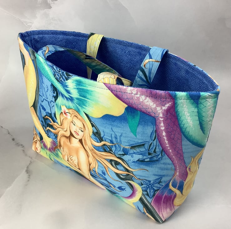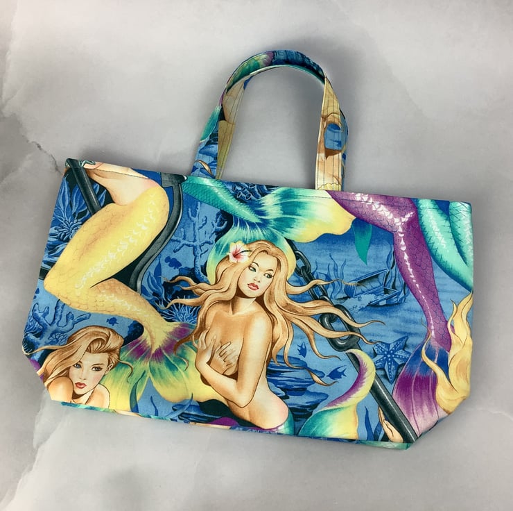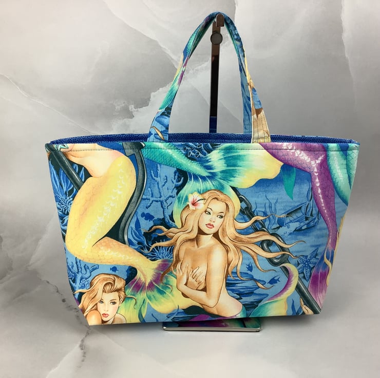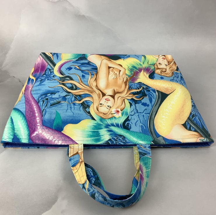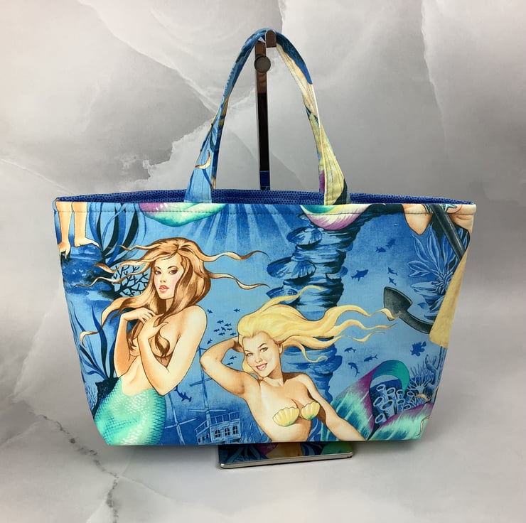 A lovely tote bag in a blue cotton fabric with retro inspired glamorous mermaids in their watery realm. Perfect for shopping, work and holidays and folds flat for storage.