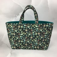 Lined in a blue patterned cotton with 2 matching handles each 14cm (5.5") drop x 2.5cm (1").