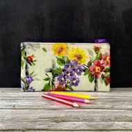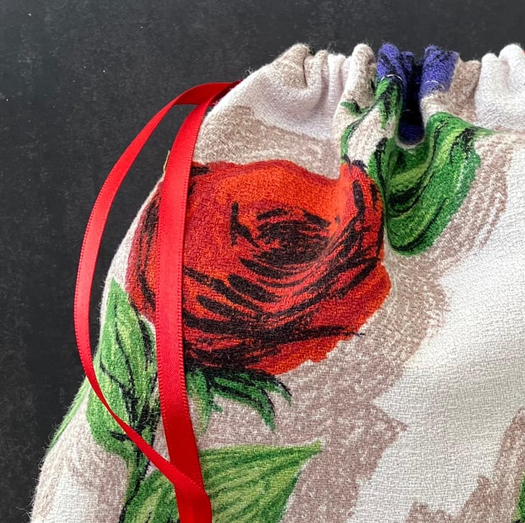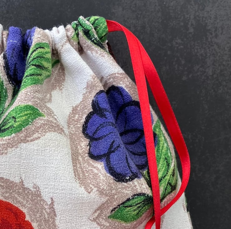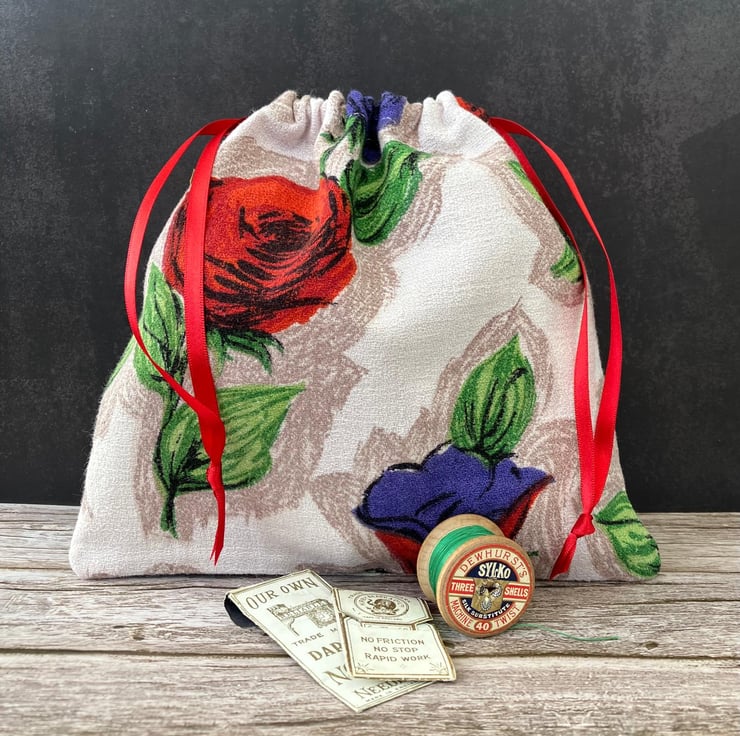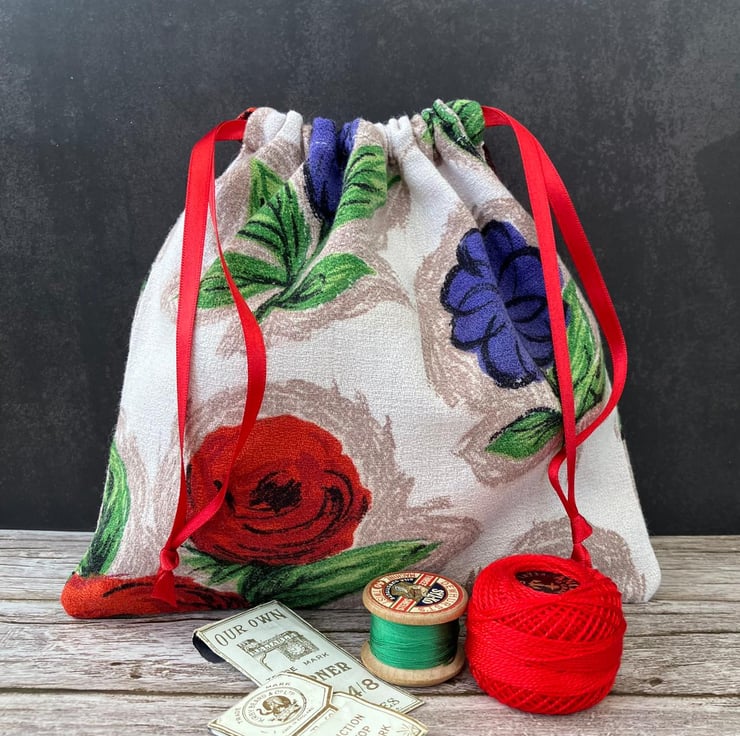1950s Vintage Barkcloth Fabric Drawstring, Bag Red Roses and Purple Flowers, Red