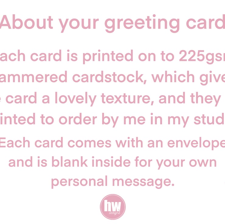 Your greeting card is printed to order and is printed on 225gsm hammered card stock which gives the card a nice texture to it. Your card will be printed by me in my studio.