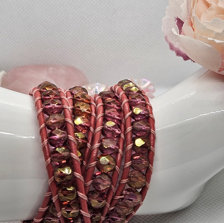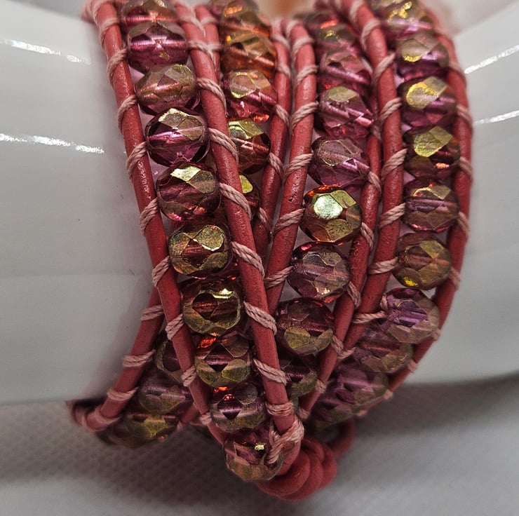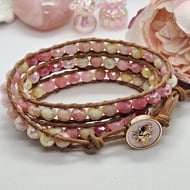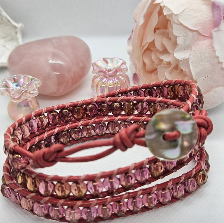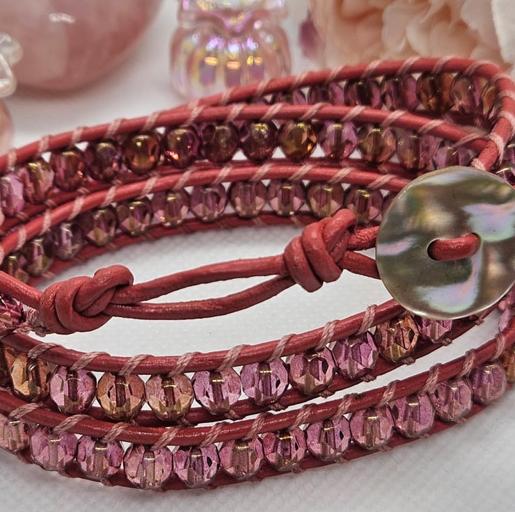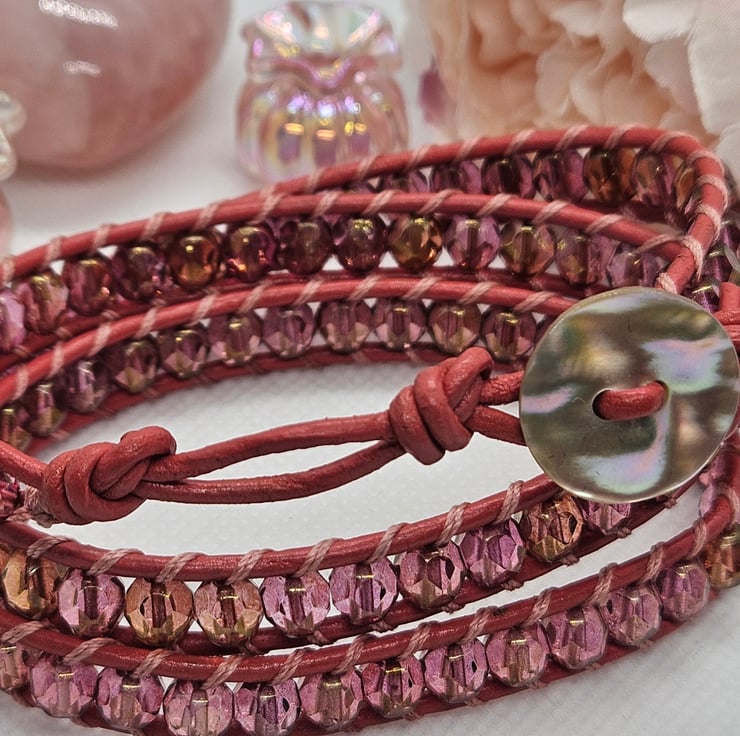 Gorgeous triple leather wrap in boho style hand sewn with deep pink AB Czech glass beads in pastel embroidery thread on to deep pink coated leather and finished with a shell pearl clasp. Adjustable to fit two sizes measuring 24" in length. This wrap bracelet is gifted in a drawstring bag with free postage.