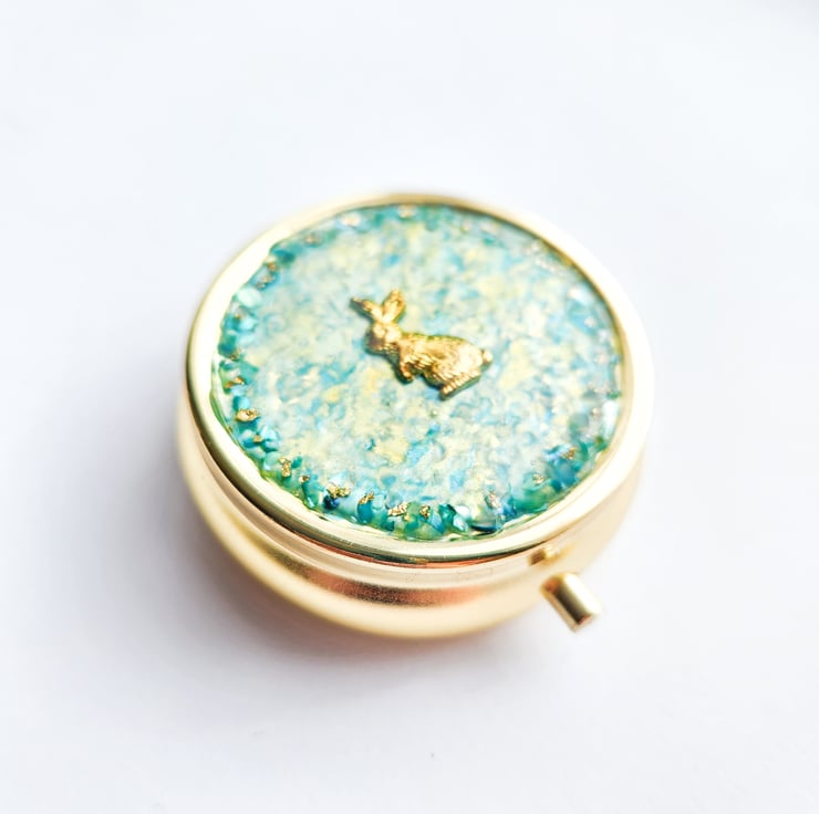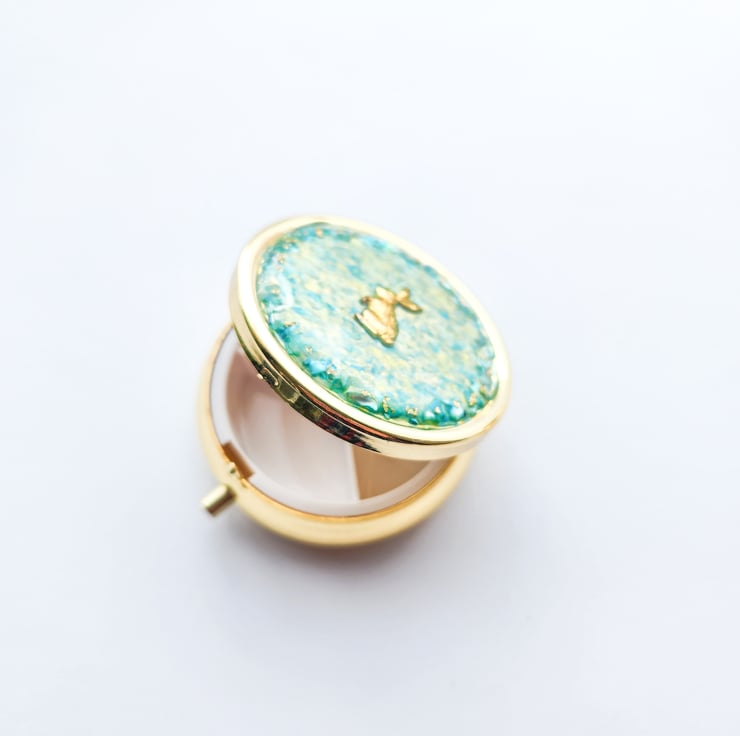 The lid is decorated with soft watercolour textures, creating gentle natural patterns. Along the edge, shell powder details add a subtle sparkle, with a small gold rabbit in the centre.