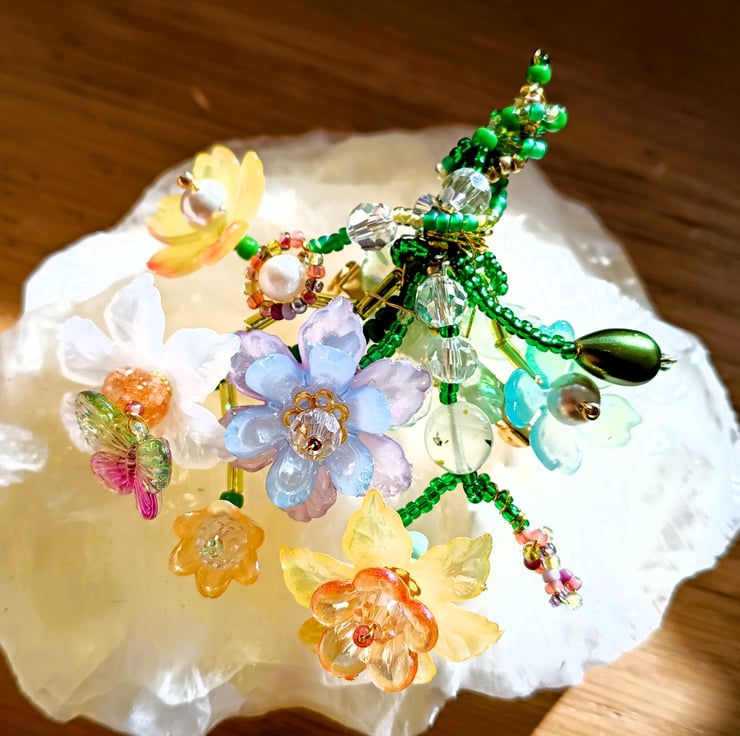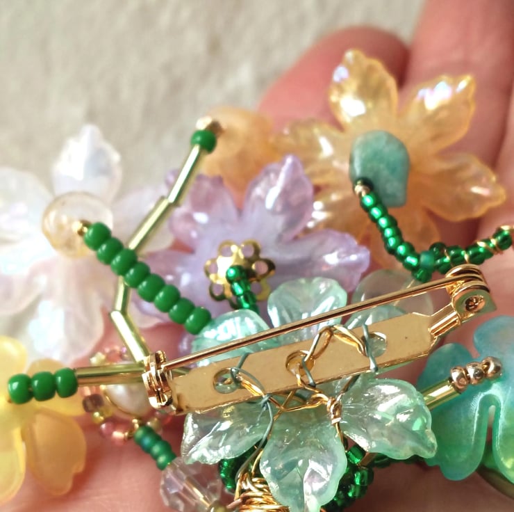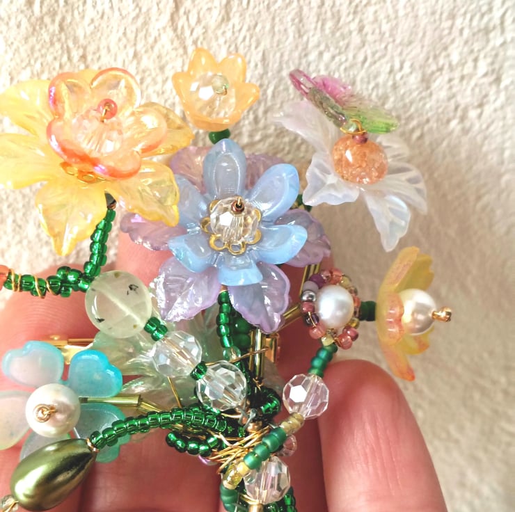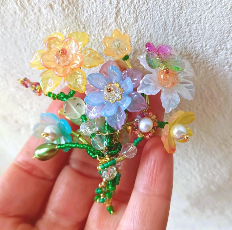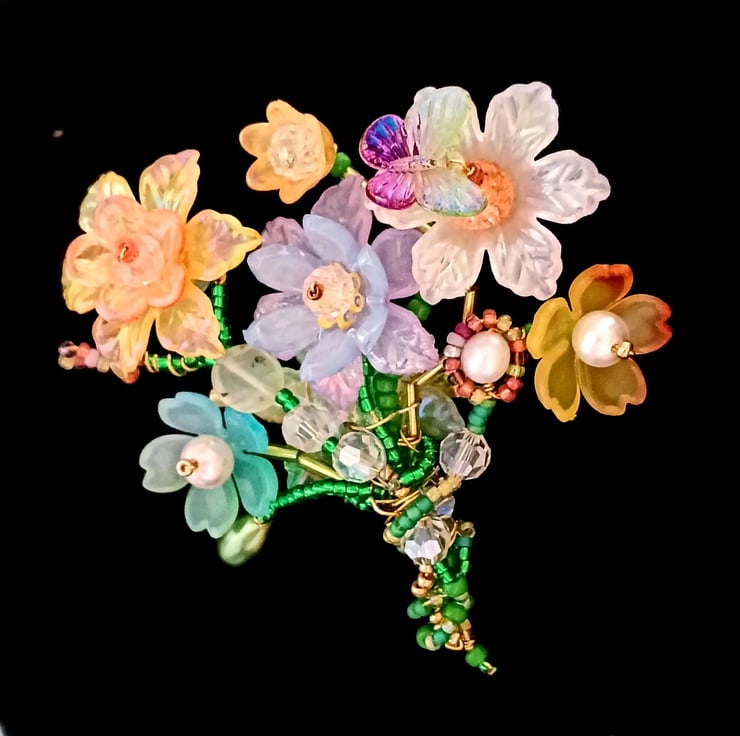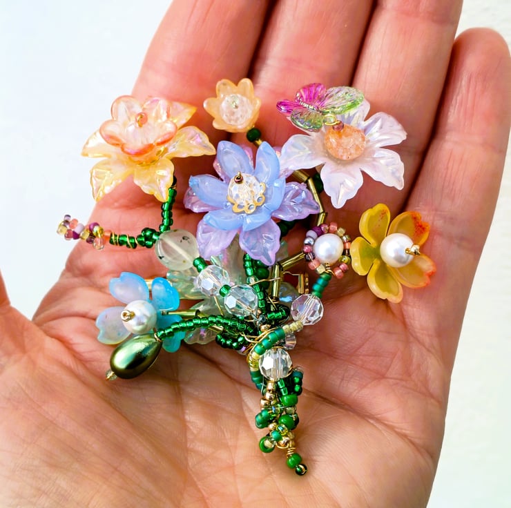This colourful spring fresh brooch is made entirely by hand, one bead at a time, to create a tiny bouquet that feels joyful, delicate, and full of character. Each flower is arranged and wired individually, giving this brooch its own unique personality. The mix of lucite blooms, glass beads, and soft pearl accents creates a lovely play of colour and texture, catching the light without feeling heavy or fussy. Size - length 70mm width 70mm approx.
