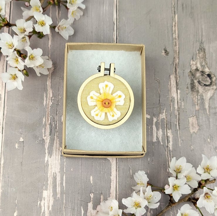 This listing is for a 40mm embroidered blossom brooch. Each one is hand embroidered with straight stitch and french knots with a coordinating button on a felt blossom with a contrasting felt centre.