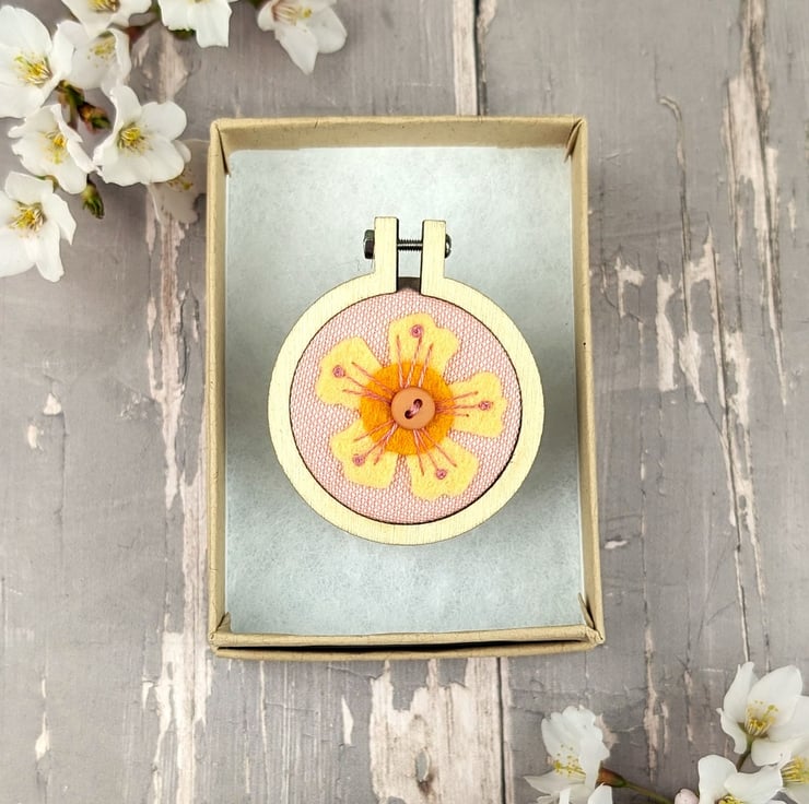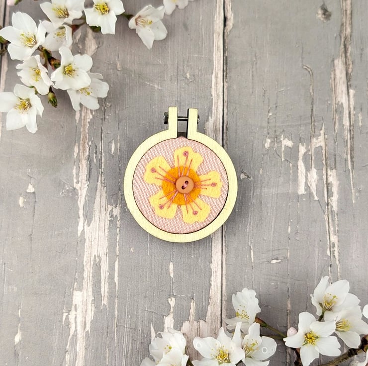 This listing is for a 40mm embroidered blossom brooch. Each one is hand embroidered with straight stitch and french knots with a coordinating button on a felt blossom with a contrasting felt centre.