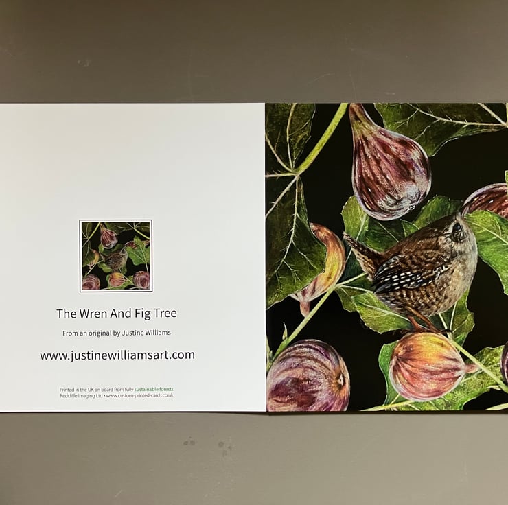 The Wren and Figs is a blank greeting card from an original coloured pencil drawing by Justine Williams. Perfect for writing a personal message or keeping as a mini piece of art.