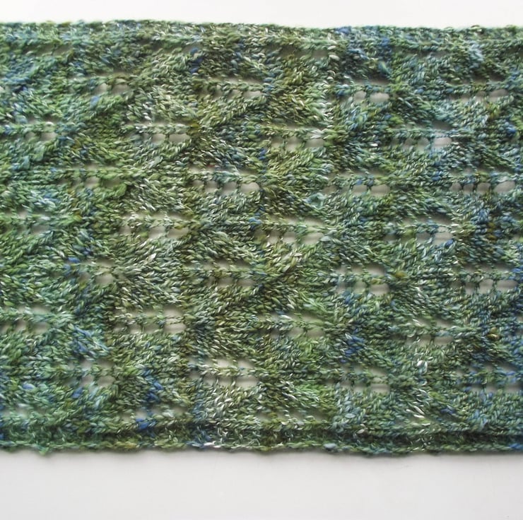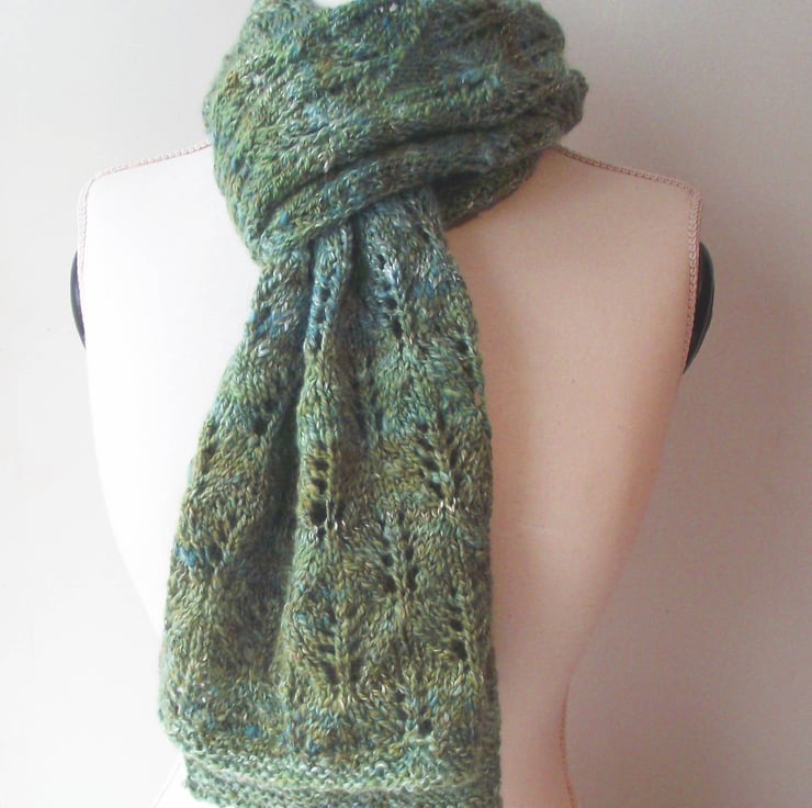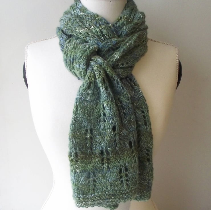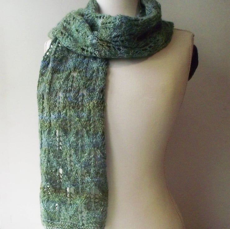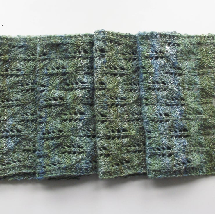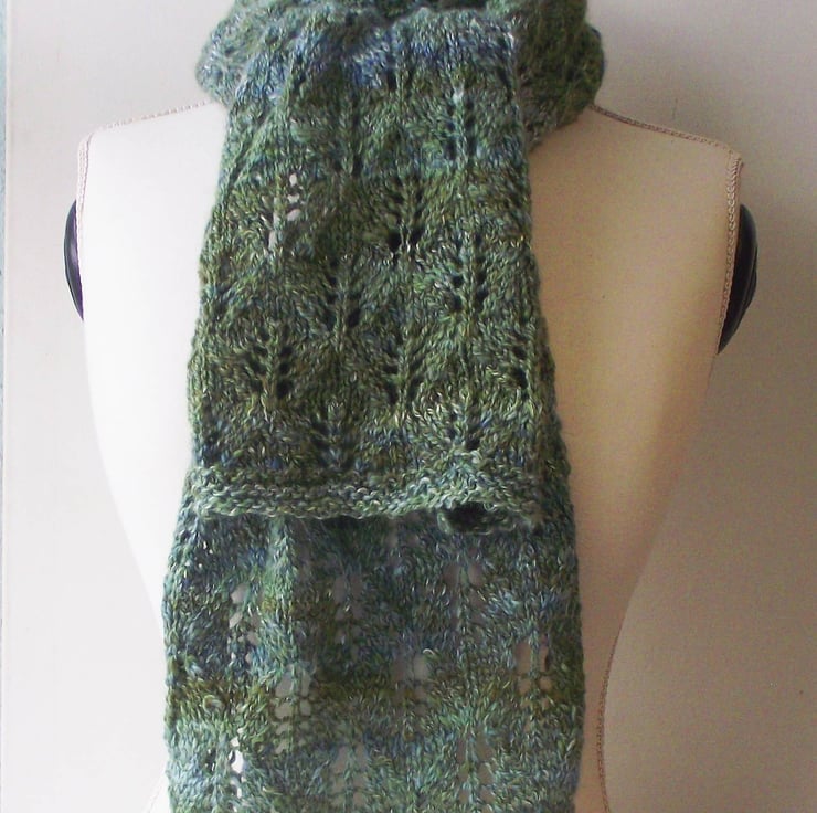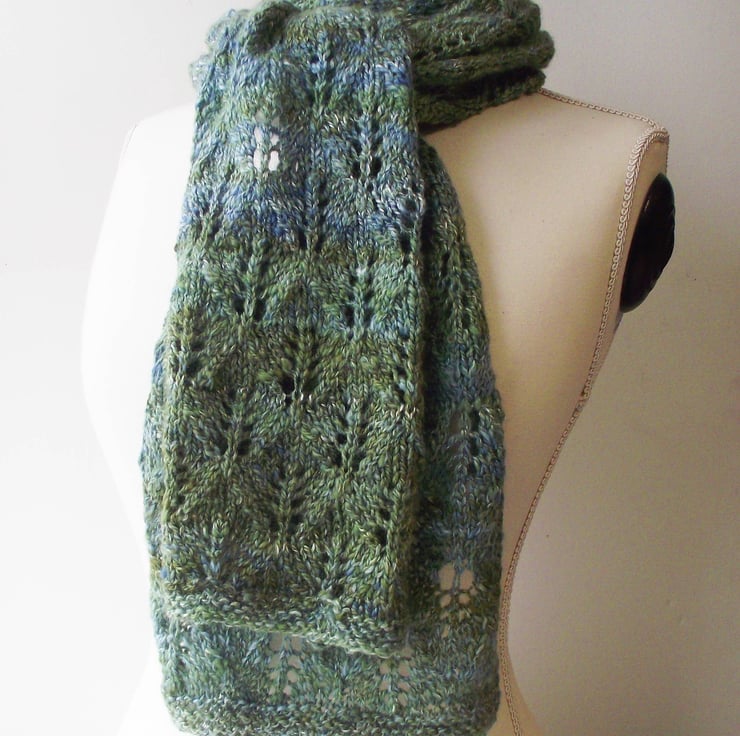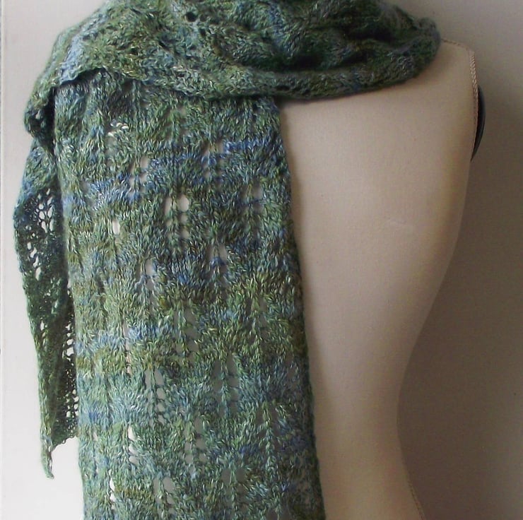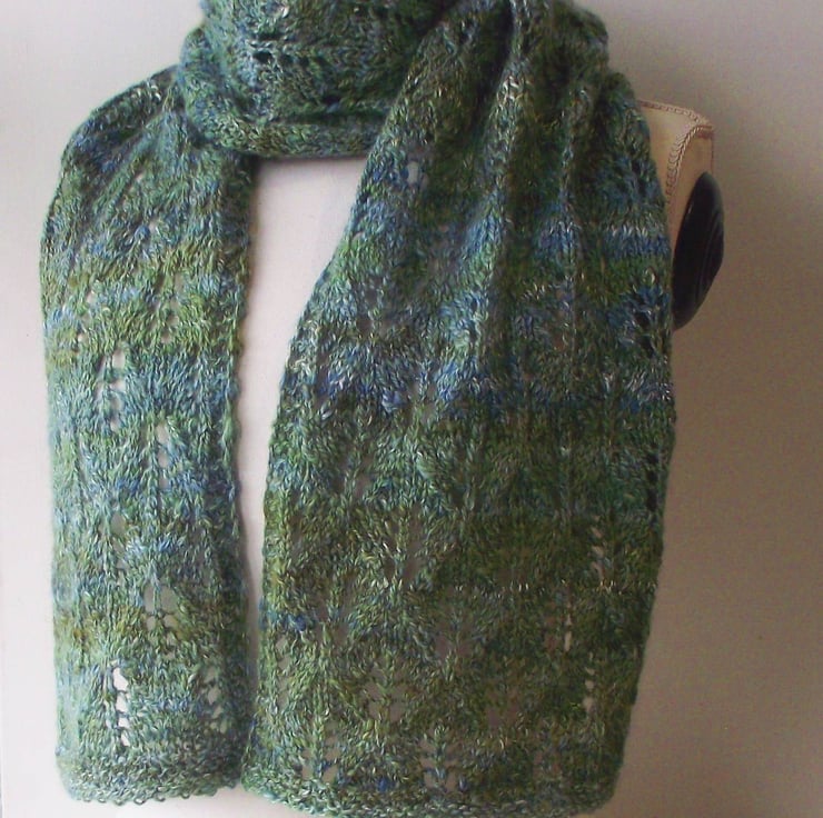 I blended some green merino with a little blue merino together with some shiny white rose fibre (which looks and feels much like silk) on my drumcarder. I then handspun this blend on one of my spinning wheels into a light weight yarn, then knitted this scarf in a pretty leaf lace stitch. The rose fibre adds shine, drape and white highlights.