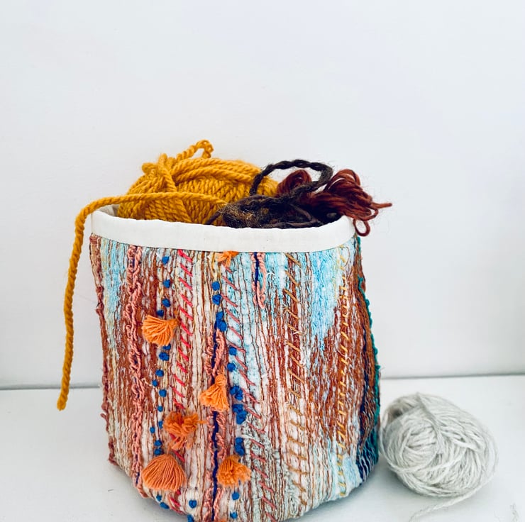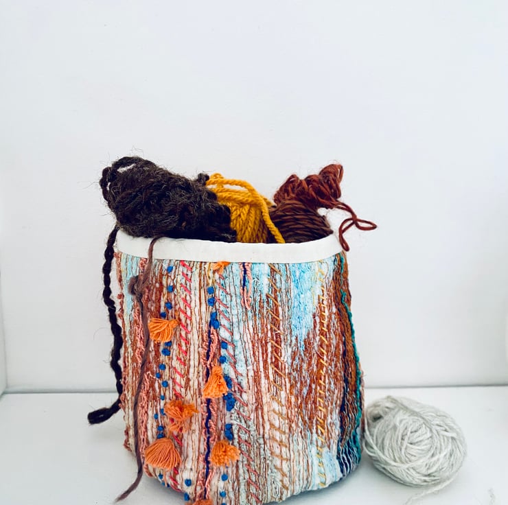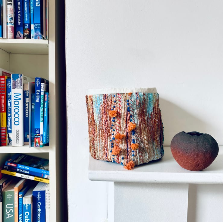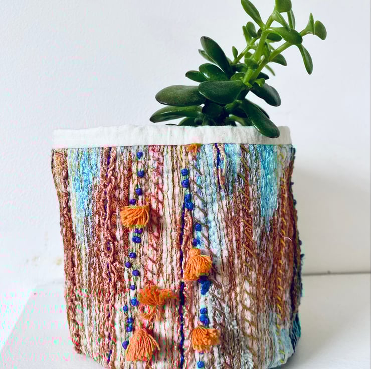 A unique and decorative pot. Made with a mix of preloved fabrics, with vibrant colours of orange and aquamarine and little hand made tassels, theres a bit of a Moroccan vibe about this one