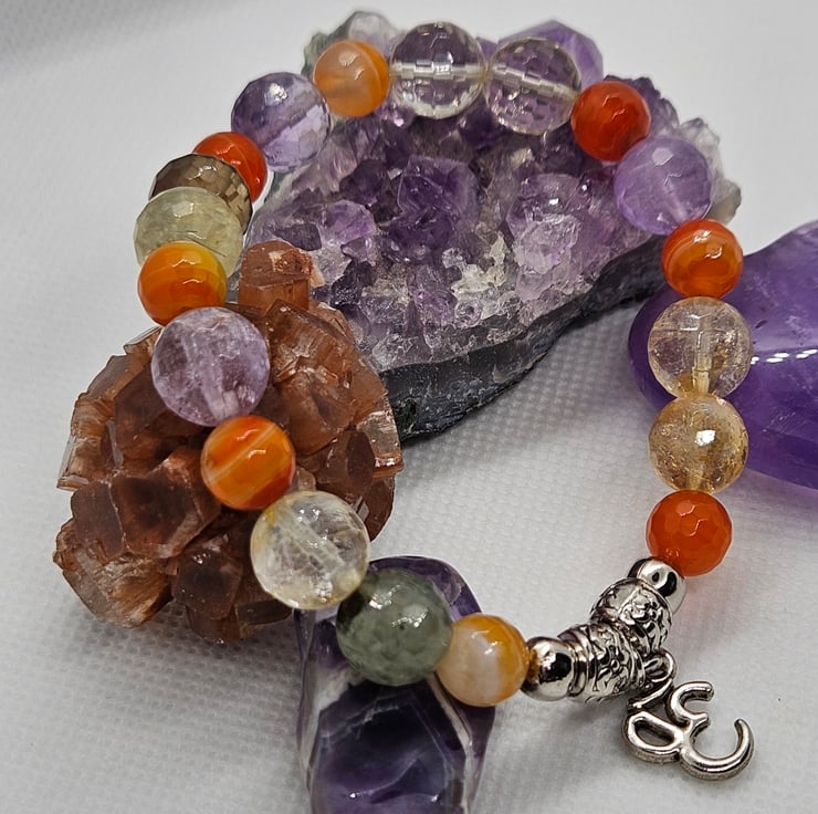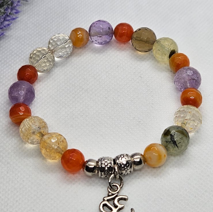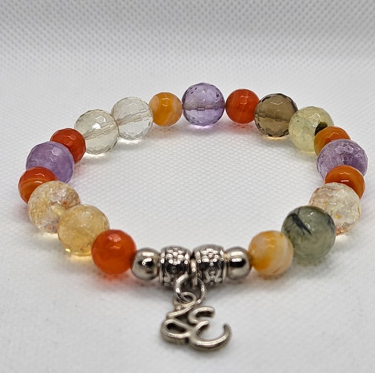 Brightly coloured faceted gemstones including amethyst, agate, citrine, prehnite and smoky quartz. Has a lovely silver ohm charm to finish. The bracelet measures 7". To check for your size measure across the bony part of the wrist and add about 1" to allow for space depending how loose or close you like your bracelets. This bracelet will be gifted in a jewellery drawstring bag and includes free postage.