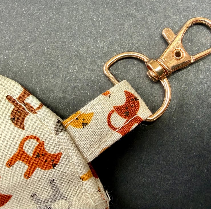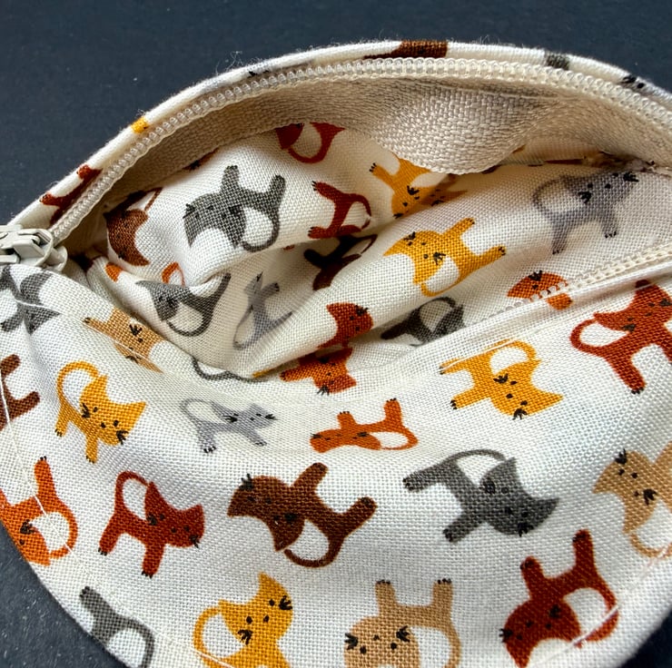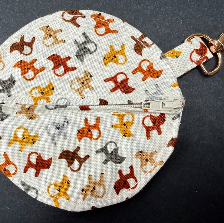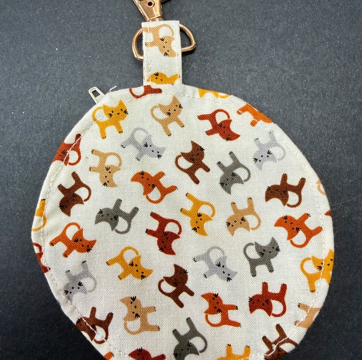 A small circular zipped pouch made from soft cotton fabric scattered with miniature dogs in grey, orange and a range of warm browns, all set against a calm cream background. The off white zip opens smoothly, and the bronze coloured lobster clasp lets you clip the pouch inside a bag, onto a belt loop or anywhere you like to keep small essentials close at hand.