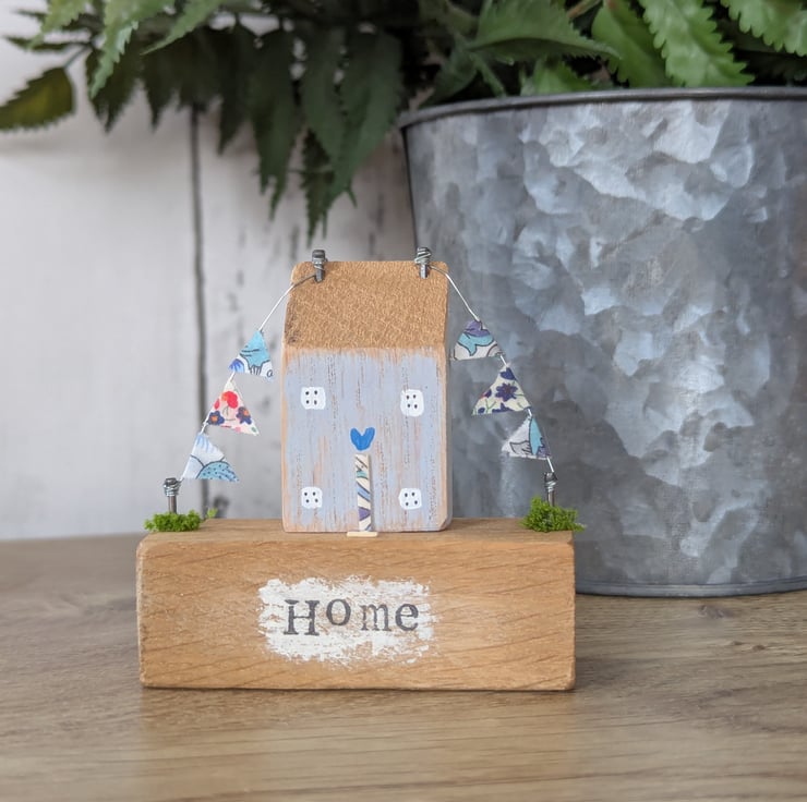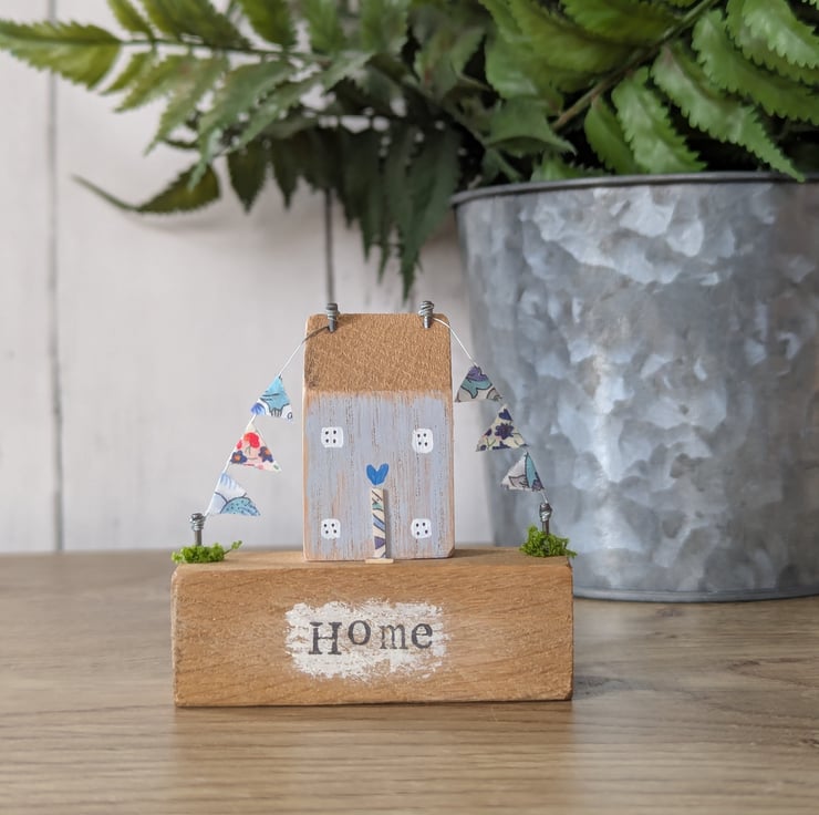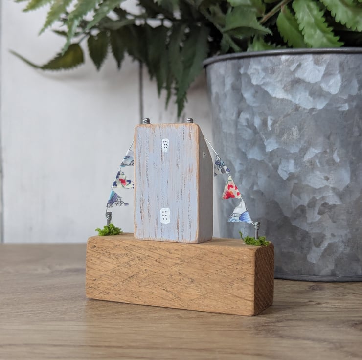 The cottage has a Liberty fabric decoupaged door and Liberty fabric bunting.