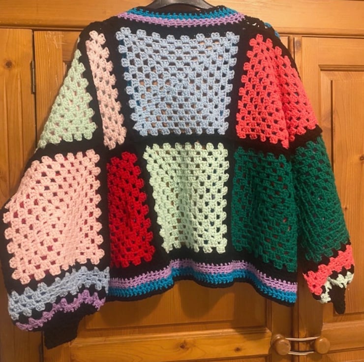 Gorgeous multi coloured patchwork style cardigan. One size, depending on how oversize you want it to be, but easily fits up to a size 20. Measures approx 72cm wide (underarm to underarm) and 58cm long.