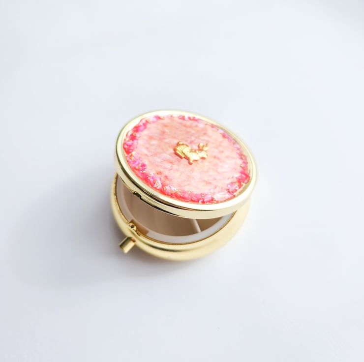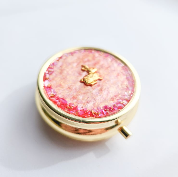 The lid is decorated with soft watercolour textures, creating gentle natural patterns. Along the edge, shell powder details add a subtle sparkle, with a small gold rabbit in the centre.