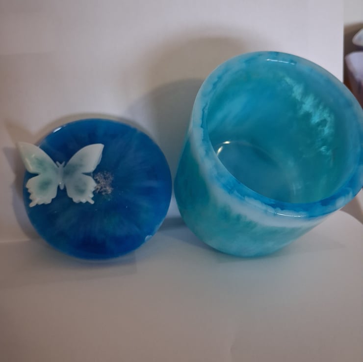 Handmade marbled epoxy resin decorative pot in shades of blues. Removable lid with butterfly decoration.