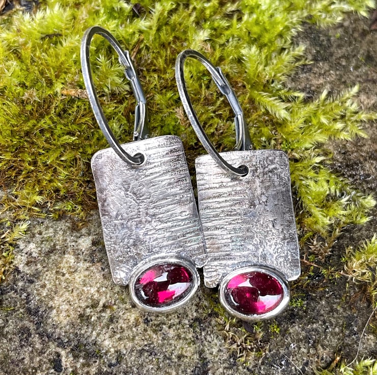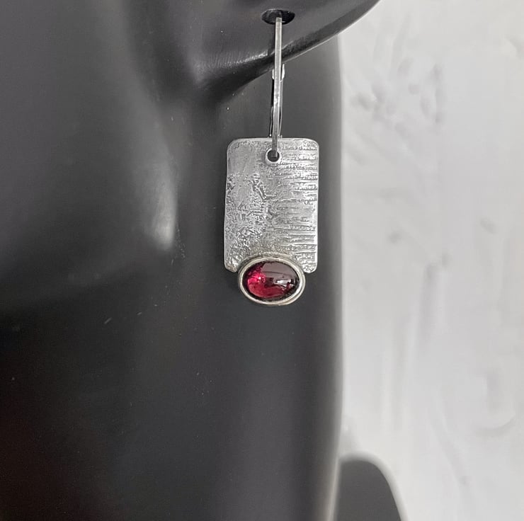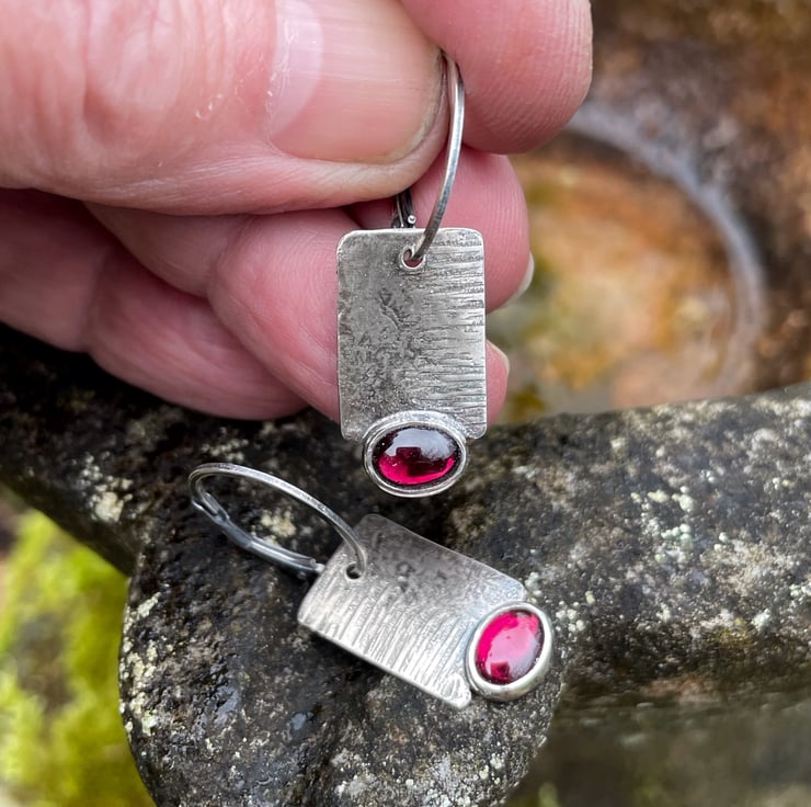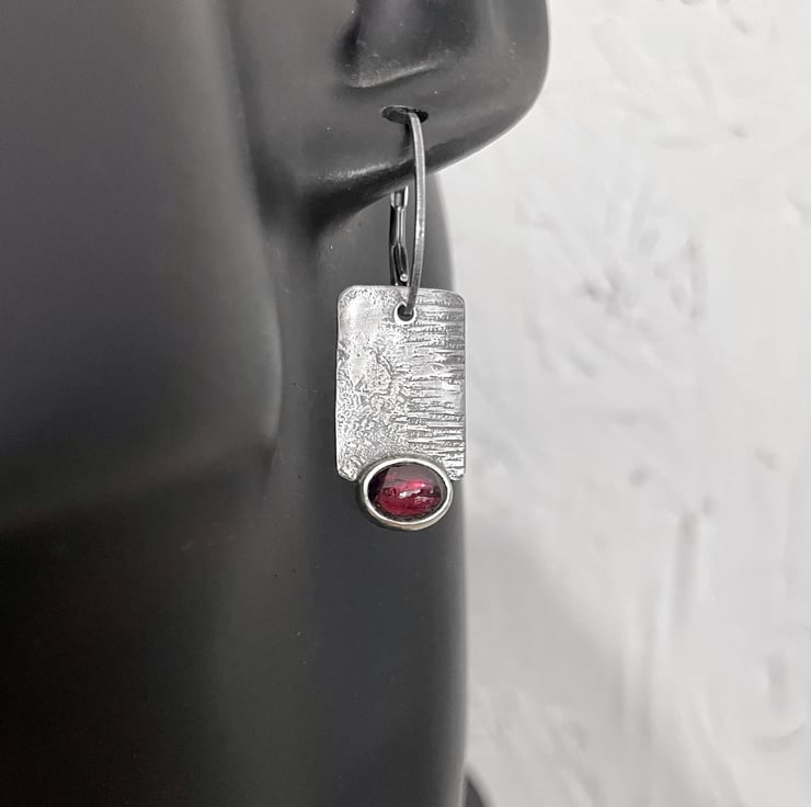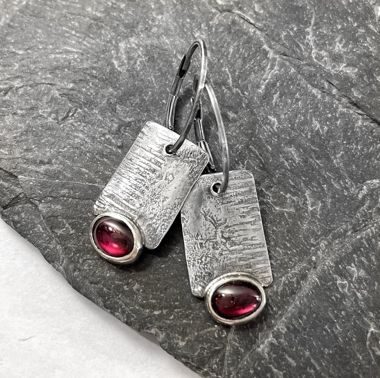 Oxidised silver and cabochon garnet industrial look earrings on lever back hoops.
